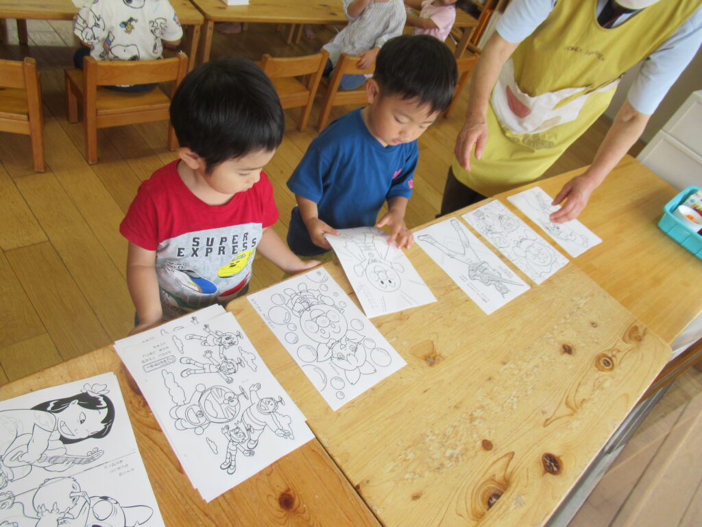 お部屋でお絵描きや塗り絵をして楽しく過ごしました。何種類かの塗り絵を並べて好きなものを選べるようにすると、一つ一つを見ながら嬉しそうに選んでいました。また、クーピーは「隣の友達と一緒に使おうね」と話をすると、「青、貸して」「どうぞ」と言いながら、仲良く使うことが出来ました。