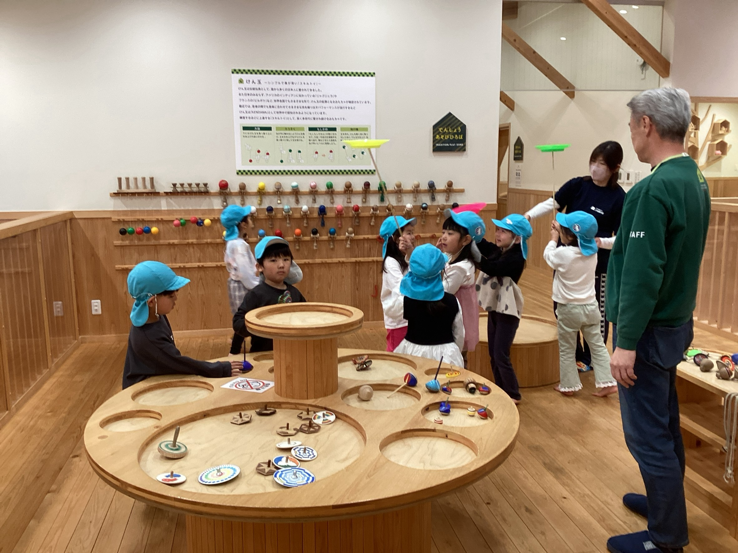 道組は檜原森のおもちゃ美術館で、木のおままごとや野菜の玩具、こま・けん玉などの伝承遊び、ボードゲームなど多様なコーナーをチームで巡り、さまざまな遊びを楽しみました。