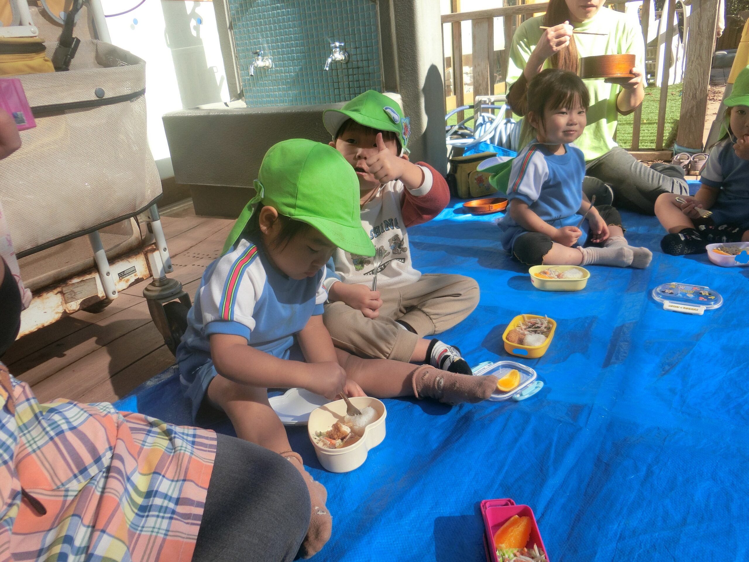 心・善組のお弁当給食の日!子どもたちがとても楽しみにしていました。天気も良く、爽やかな青空のもと、心組はウッドデッキで、善組は2階テラスでお弁当を食べました。いつもよりも食事もすすんでおいしいねと楽しく食べることができました。