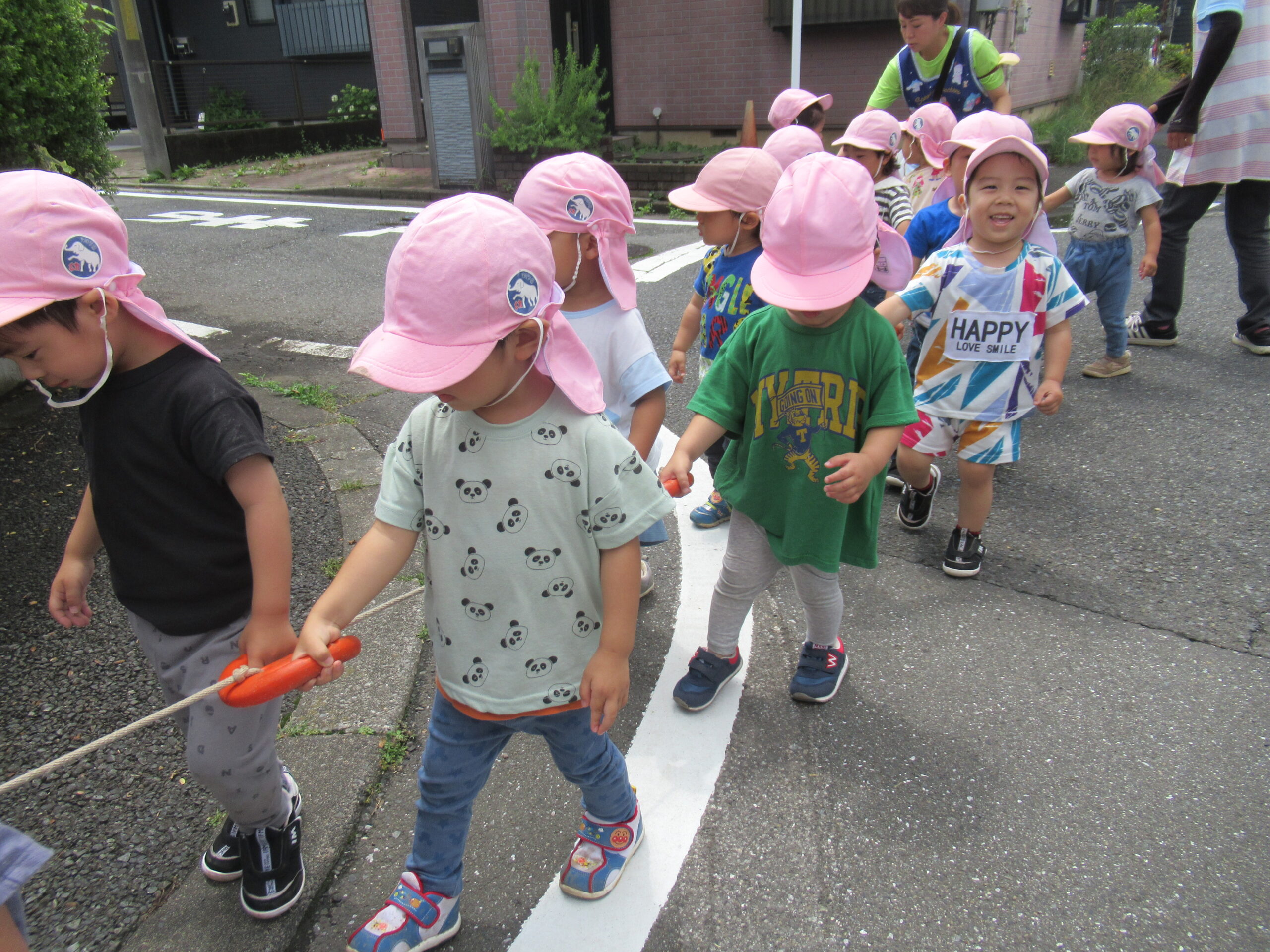 園の周りをお散歩しました。お散歩ロープにつかまりながらお友達と「さんぽ」を歌ったり、「たんぽぽが咲いてて奇麗だね」とお話したりして楽しく歩きました。