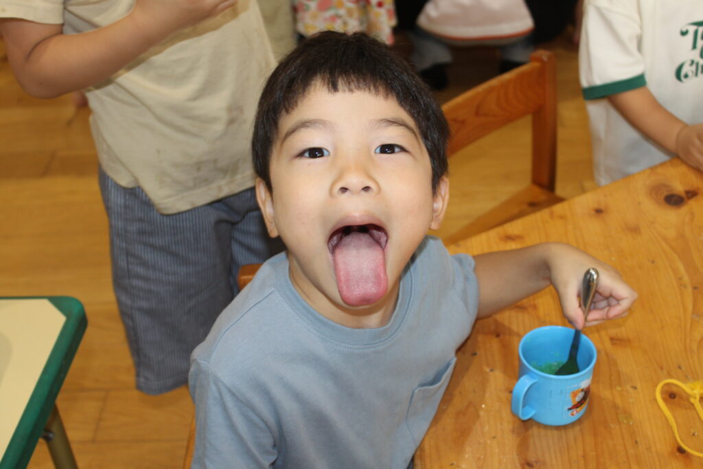 「今日はみどりいろのシロップにするんだ~」「ぼくはレインボー」等と嬉しそうにかき氷機の前に並び始めた子どもたち。
