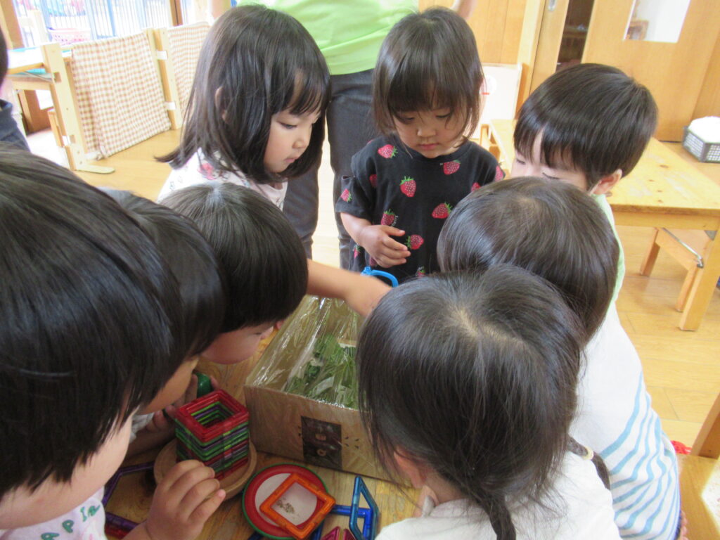 光組ではめだかの赤ちゃんが生まれました。子どもたちは「おさかなさん、おさかなさん」と水槽に話しかけています。心組には蚕がいて、蚕の餌の桑の葉の匂いを嗅いでいい匂いと言う子や、大きくなって蝶になると思っている子もいて日々成長していく様子を楽しんでいます。そして、自分で捕まえただんご虫の入っている虫かごは毎日眺めて大切にしています。身近にいる生き物から、いのちの大切さを感じてもらいたいです。