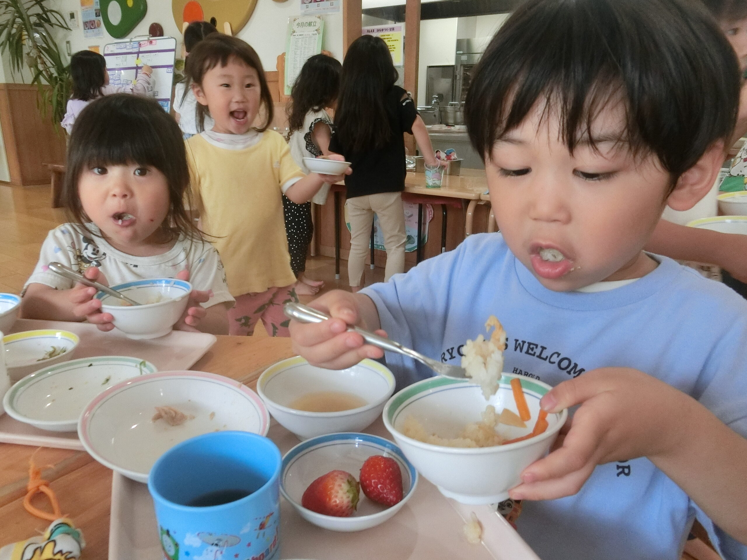 朝の食育でたけのこの皮むきをしました。匂いをかぎ観察した後、はじめは「どーやるの?」とためらっていましたが、剥き始めると「楽しい!」と夢中になっていました。給食はたけのこ御飯!外で元気いっぱい遊んだ後、旬のたけのこ御飯を美味しくいただきました。春の訪れを感じさせてくれる食育となりました。