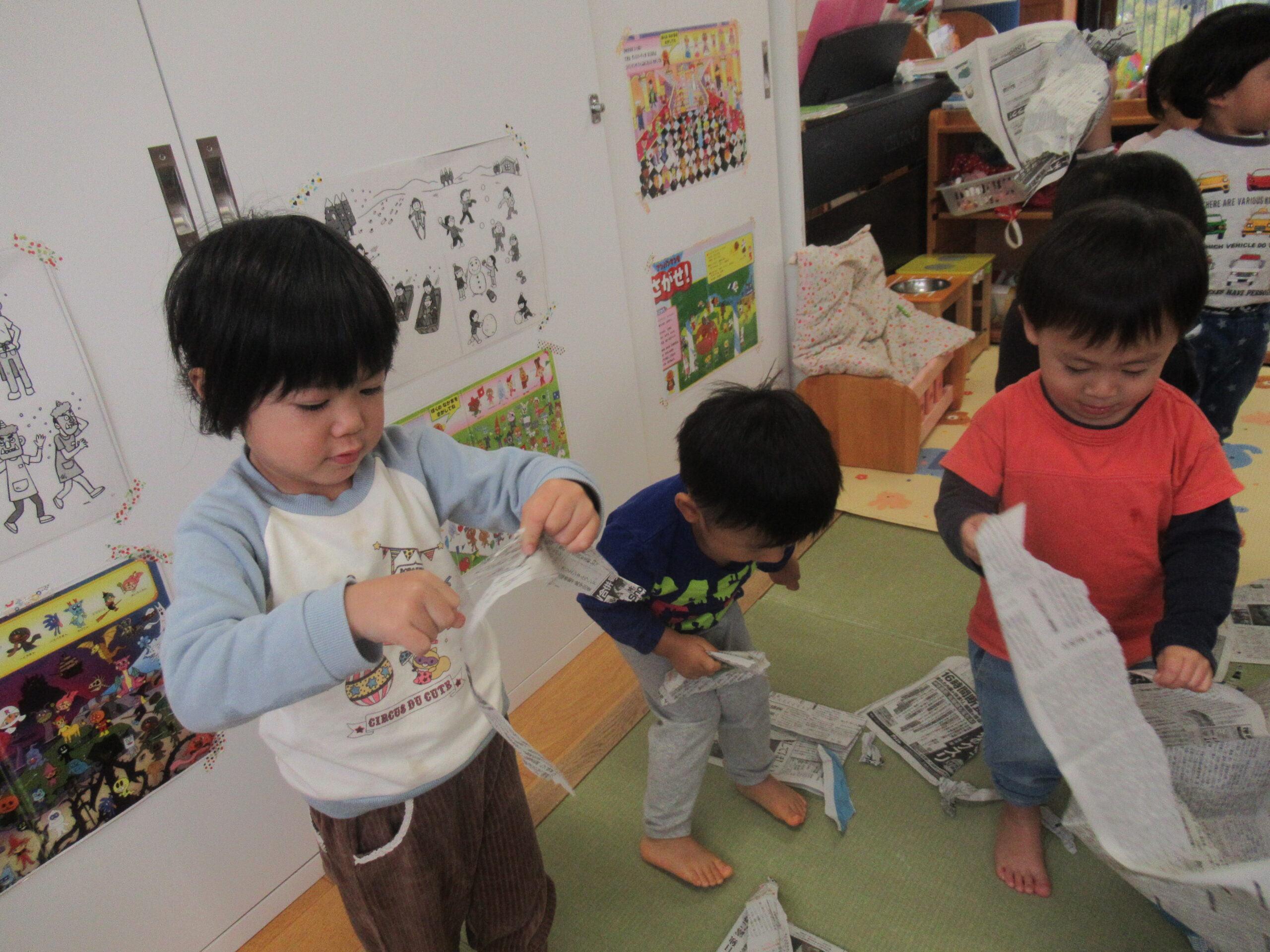 今日は新聞紙破りを楽しみました。手先が器用になってきた2歳児の子どもたちは手先を使って上手に破くことができていました。新聞紙が床に落ちているのを見ると「プールだ」と泳ぐ子がいたり、「おにぎりつくったの」と丸める子がいたり、保育室に飾ってある鬼に「おにはーそと」と豆まきを楽しむ子がいました。