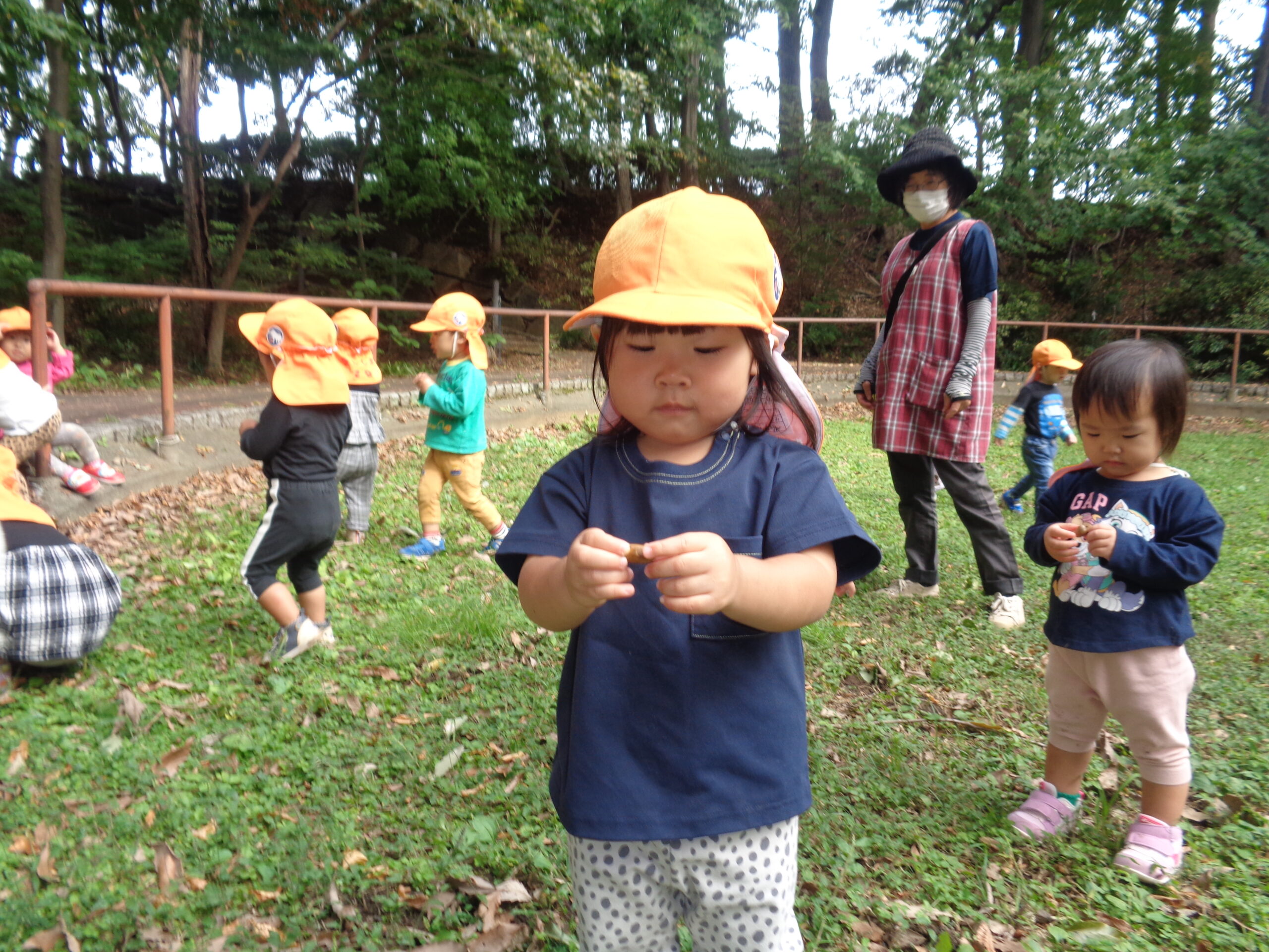 清水公園に遊びに行きました。 「よーいど~ん!」と言いながら広い敷地を走り回って楽しみました。 コスモスやみかんの木を見たり、どんぐりや落ち葉を拾ったりして秋を感じながら散歩を楽しみました。