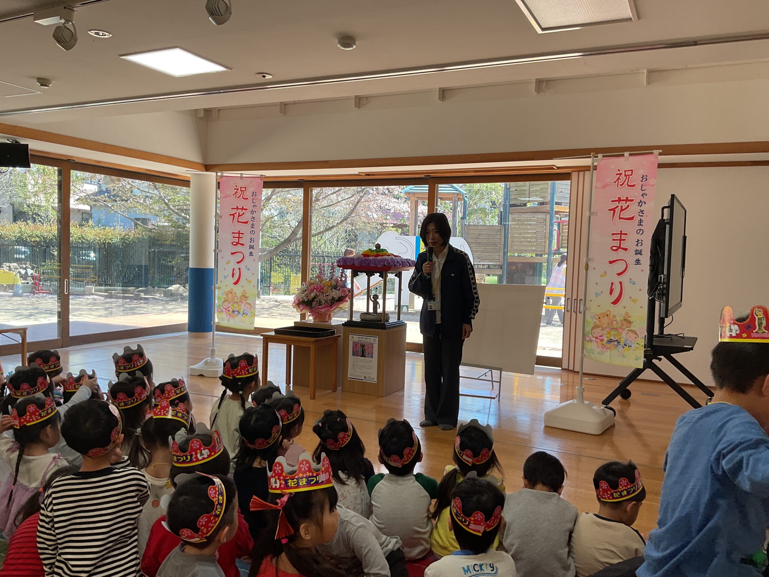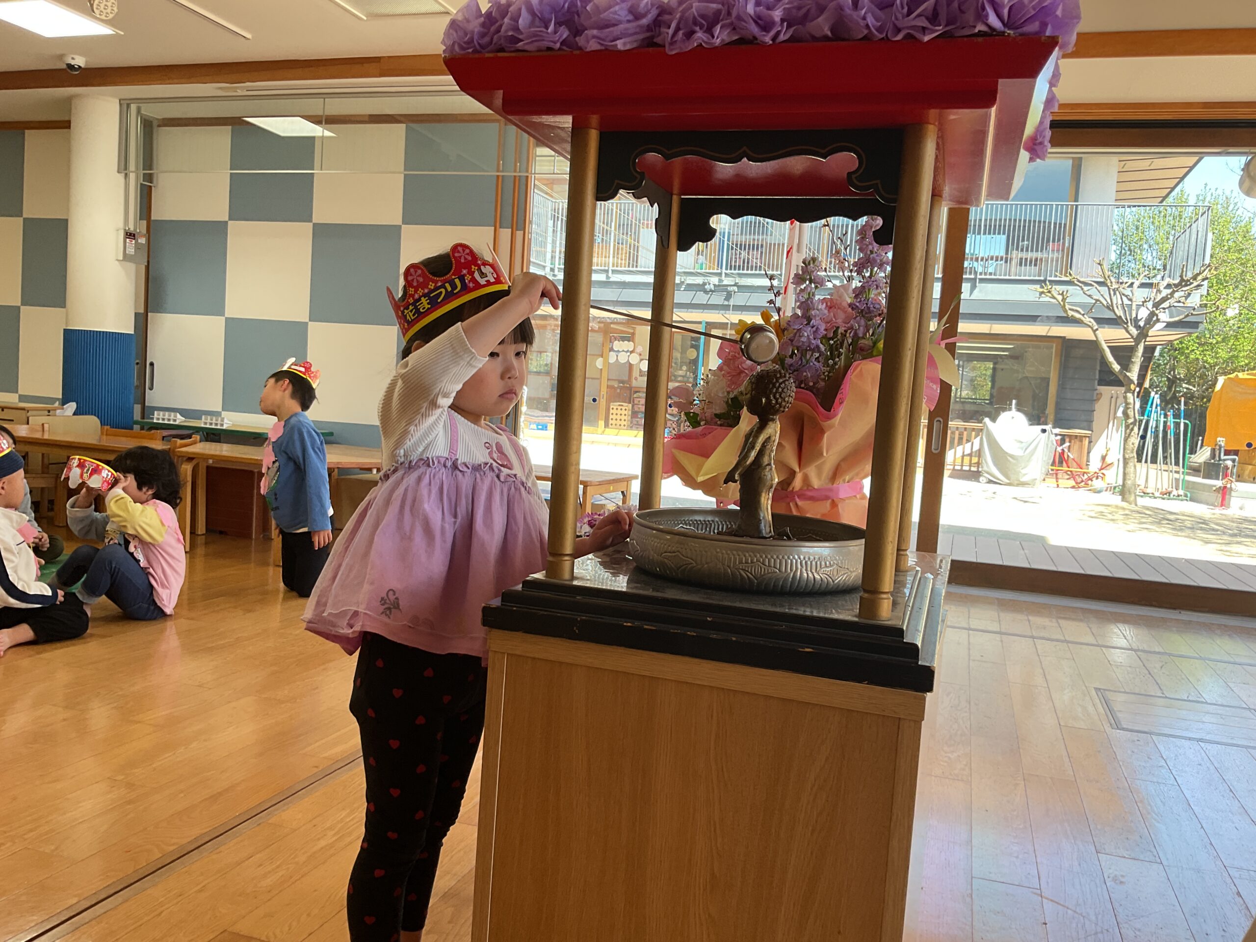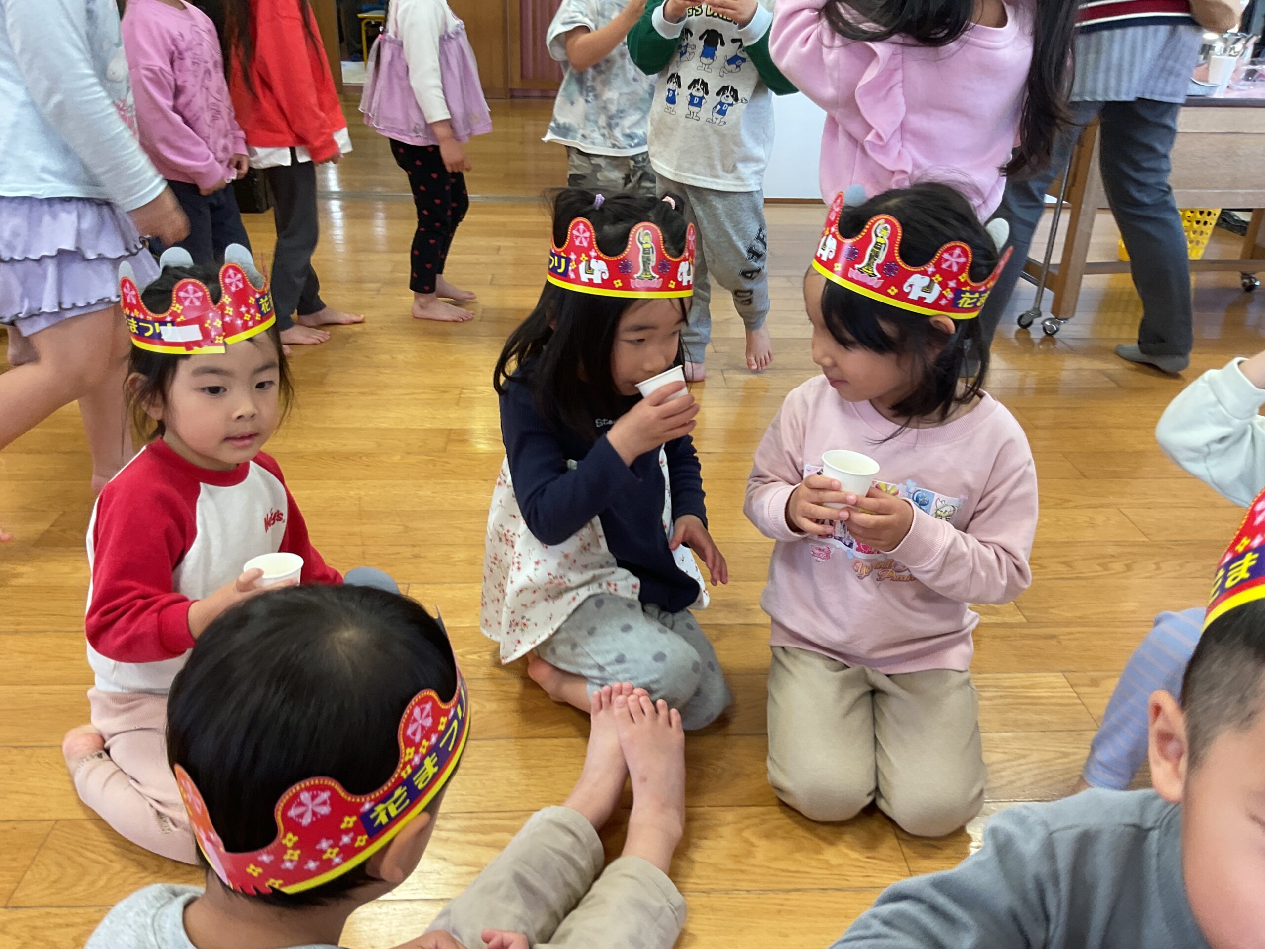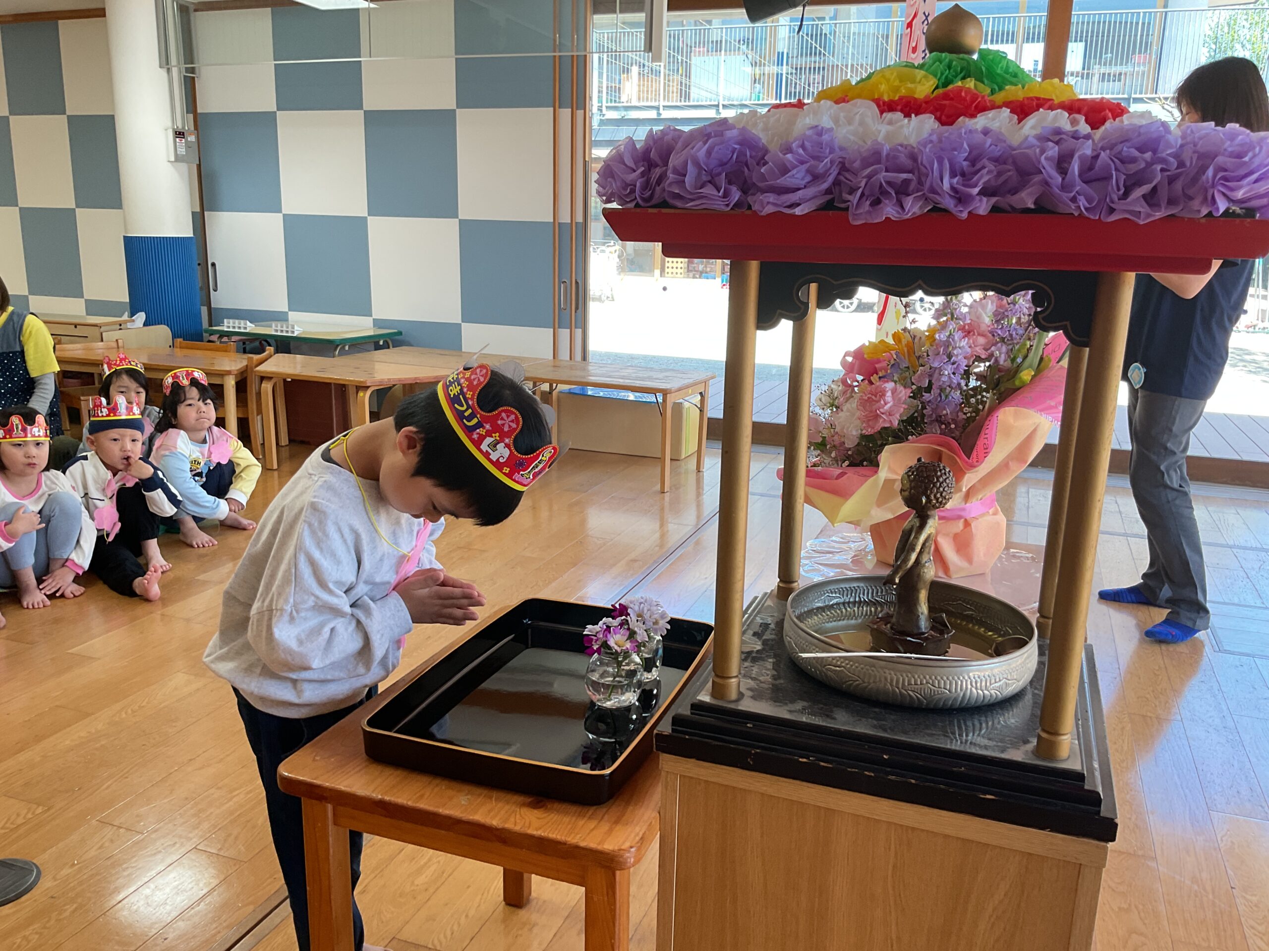 お釈迦様がお生まれになった日を、みんなでお祝いしました。真剣な表情で献花をしたり、甘茶をかけたりしていた子どもたち。パネルシアターで由来を伝えると、「仙人だって」「龍が出てきたね」と少し難しい話にも興味を持てたようでした。最後は甘茶を飲み、「甘い!」「いつものお茶と違うね」と味わっていました。
