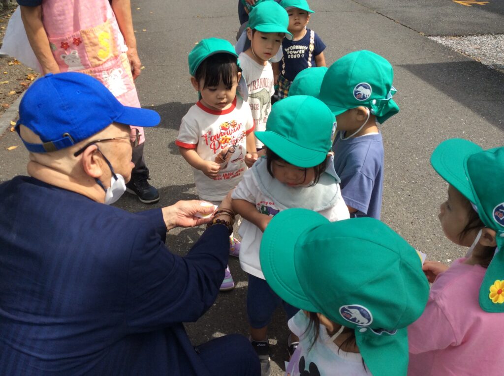 10月2日光組 はなみずきちびっこ公園に遊びに行きました。スプリング遊具や虫探しをし、帰りには理事長に頑張って歩いたね。と一人一人シールを貰い喜んで手に握りしめていた子どもたちです。
