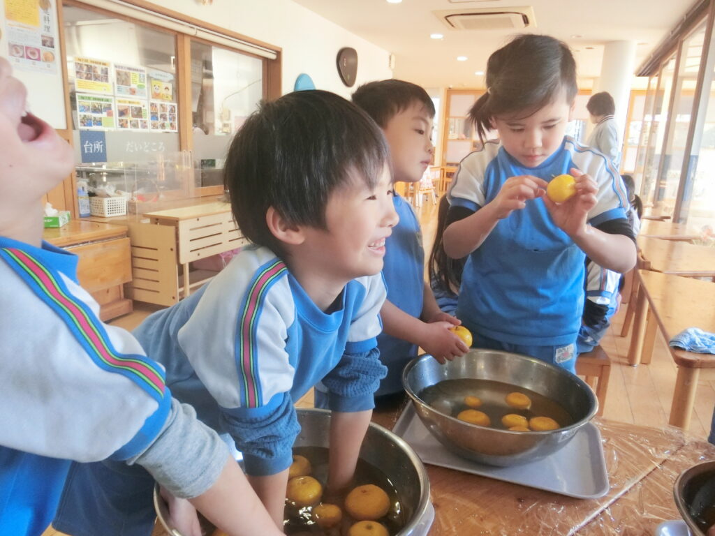 温かいお湯に、いい香りのゆずを浮かべ、園では一足早く子どもたちがゆず湯体験をしました。