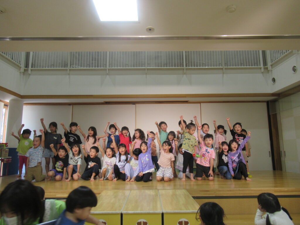 広間で子どもたちが舞台に上がる「わくわくデー」がありました。ファッションショーやコマ回し、ピアニカと鈴で「きらきら星」の合奏、曲に合わせたダンスなど、自分で取り組みたいものを選択し披露しました。緊張している子もいましたが、最後の「フルーツポンチ」や「ジャンボリーミッキー」のダンスでは笑顔も見られました。