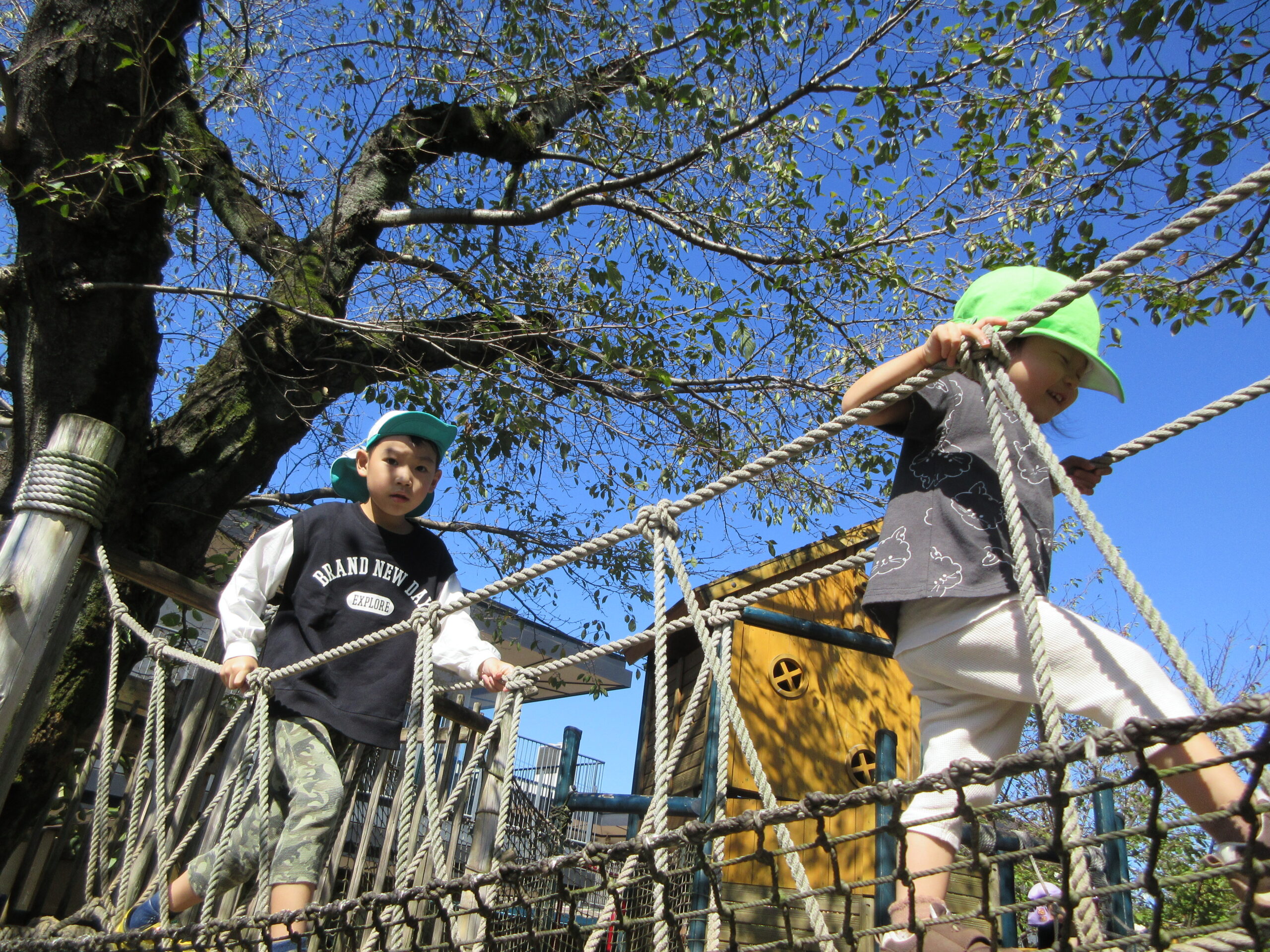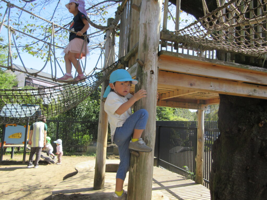 秋晴れの気持ちの良い日です。今日もたくさんの子ども達が、園庭にあるアスレチックで遊んでいました。日頃からの運動遊びで、体もますますしっかりし、バランスよくロープ渡りをしたり、ロッククライミングをしたりしています。「おーい、ここにいるよー」「見て見て、アスレチックのお部屋まで登れたよ。」楽しかったね。また遊ぼうね。