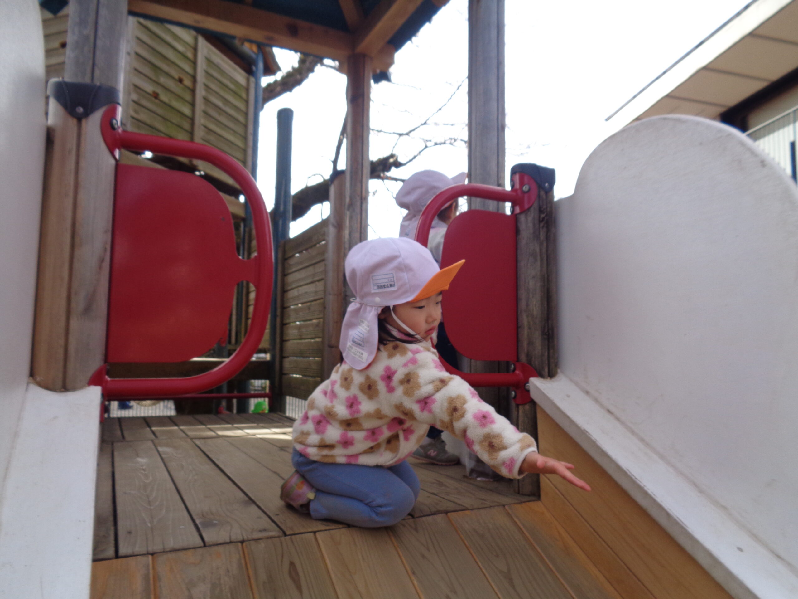 今日もたくさんの子どもたちが、園庭にあるアスレチックで遊んでいました。日頃から年上の友達の姿を見て、バランスを取り腕や足の力を使って登っていました。見守る中で友達同士ですべり台の上から「おいでー」「つかまって」と手を差し伸べる優しい姿も見られました。友達同士で協力して遊びの幅が広がっています。