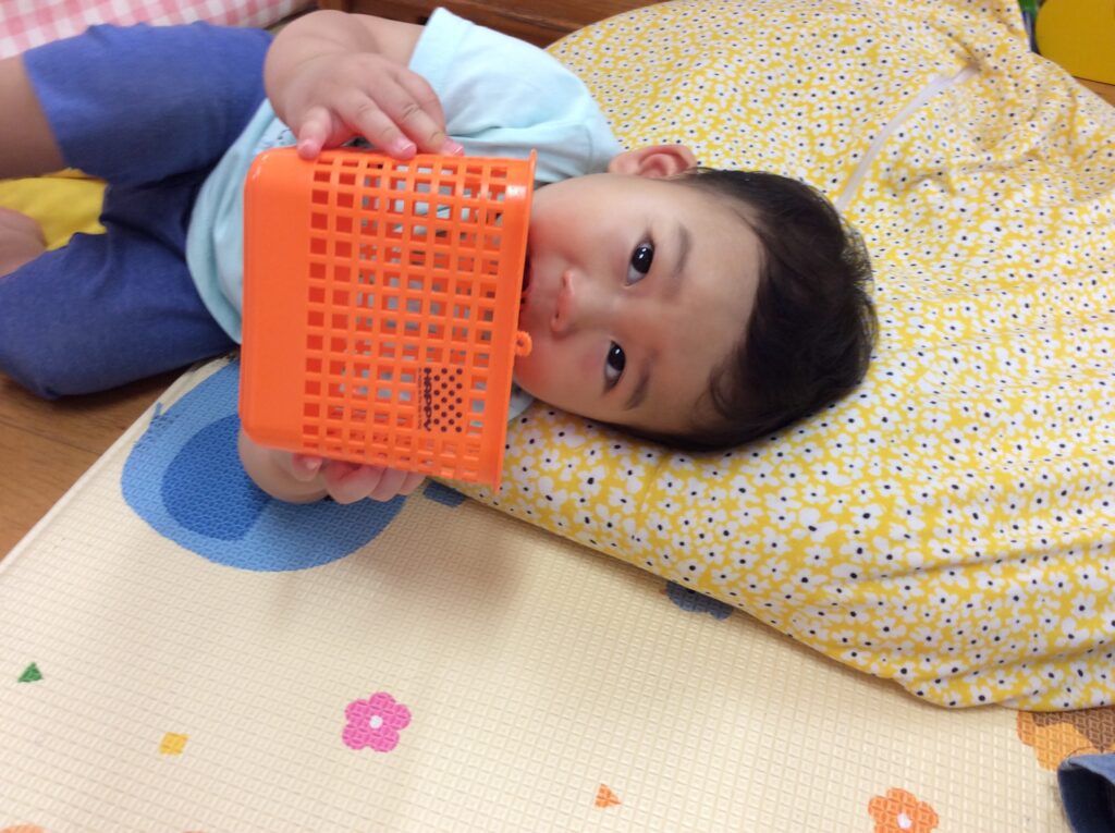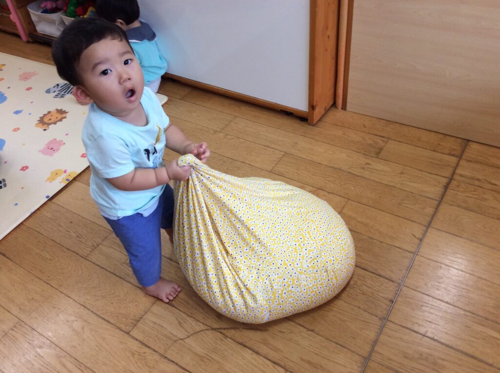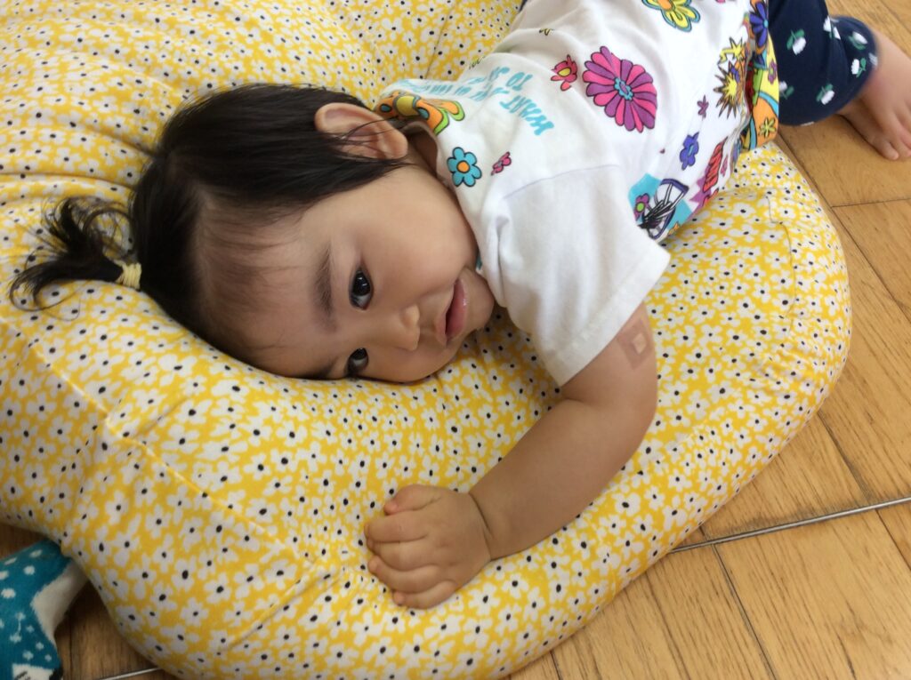 クッションのカバーを黄色の花柄に変えてみました。すると、沢山の子どもたちがクッションに集まり大人気です。自分と同じ大きさのクッションを運び、好きな位置に持って来て横になったり、友だちと仲良くくつろいだり、お気に入りの玩具を持って寝ころぶ子など様々です。