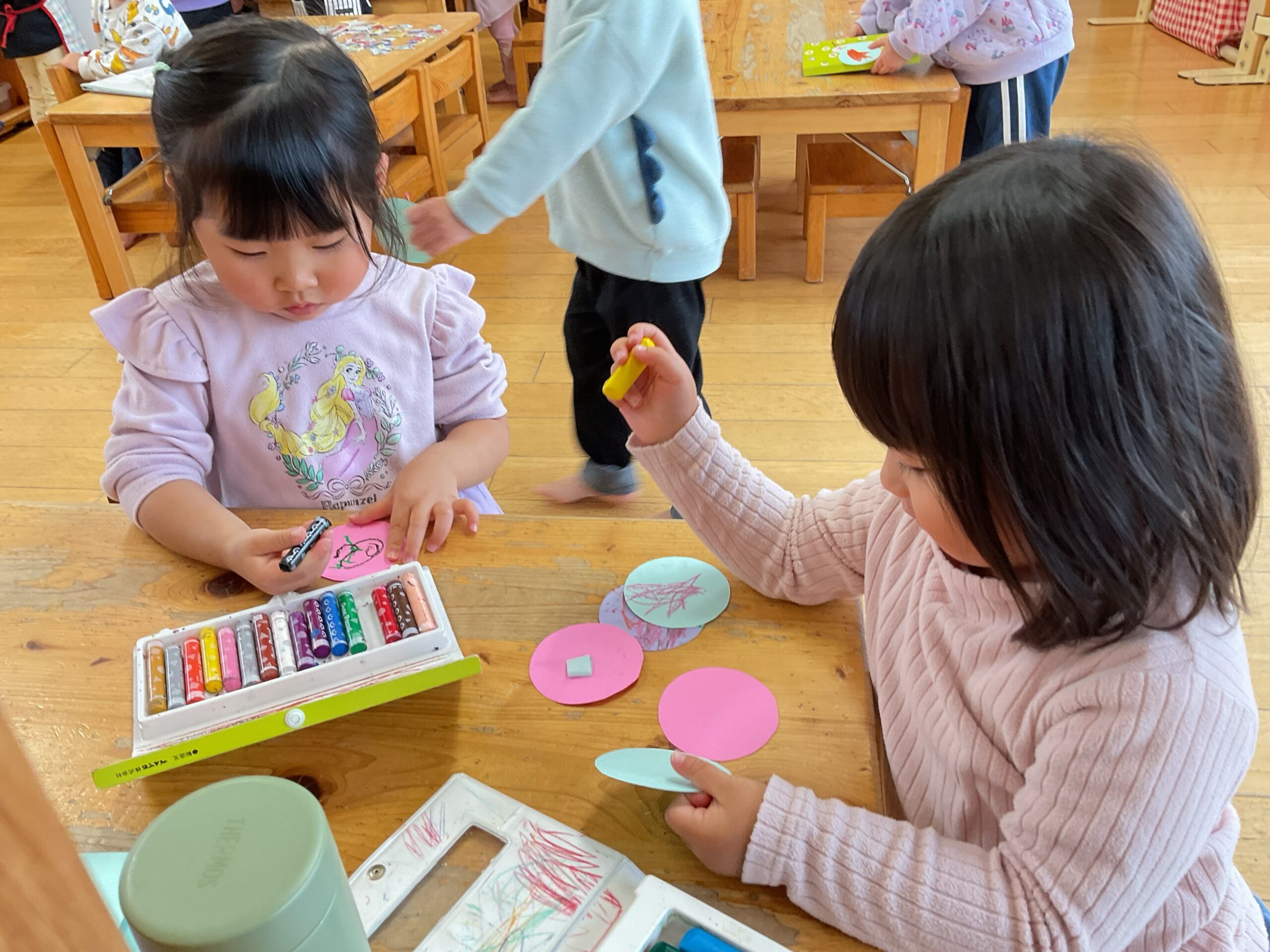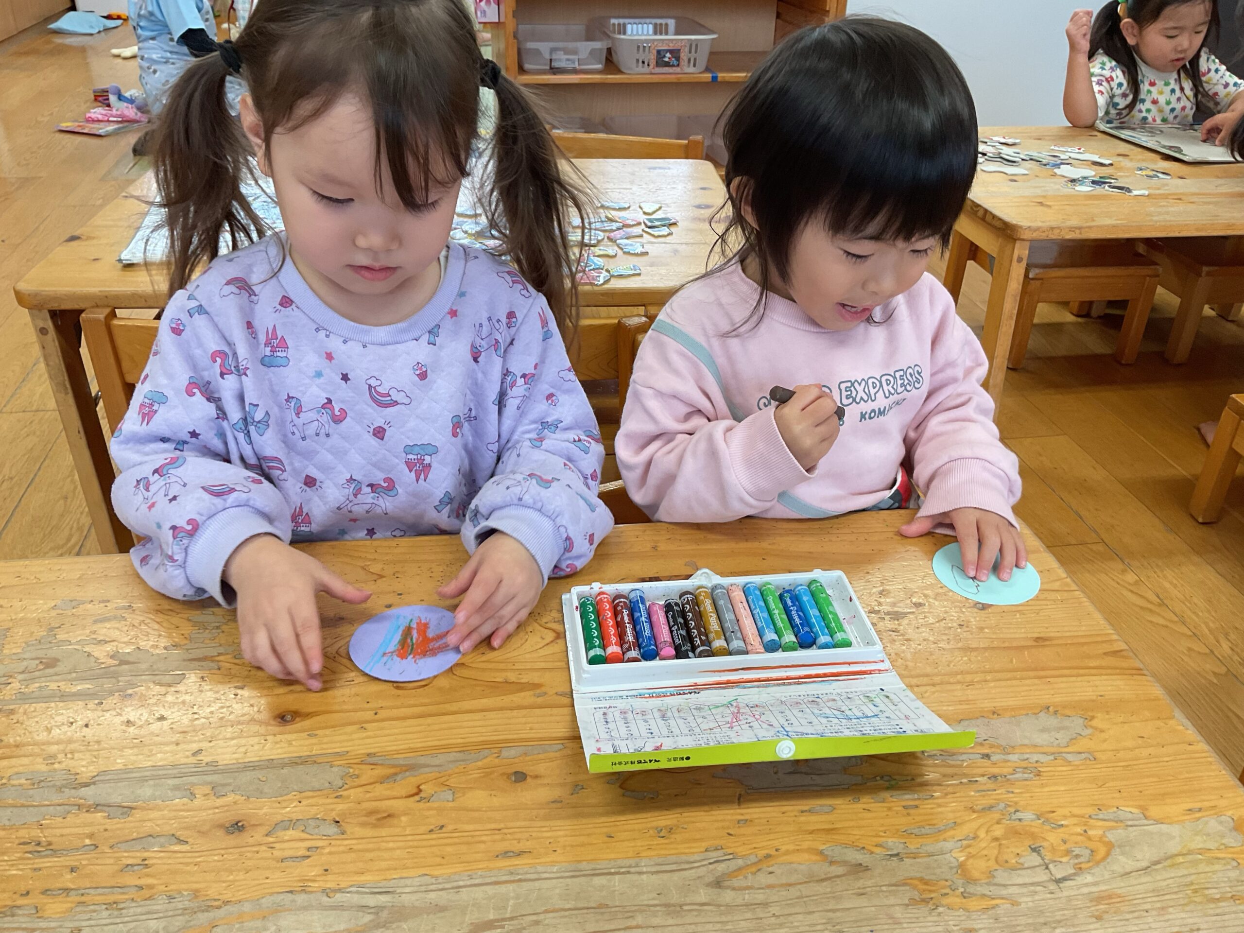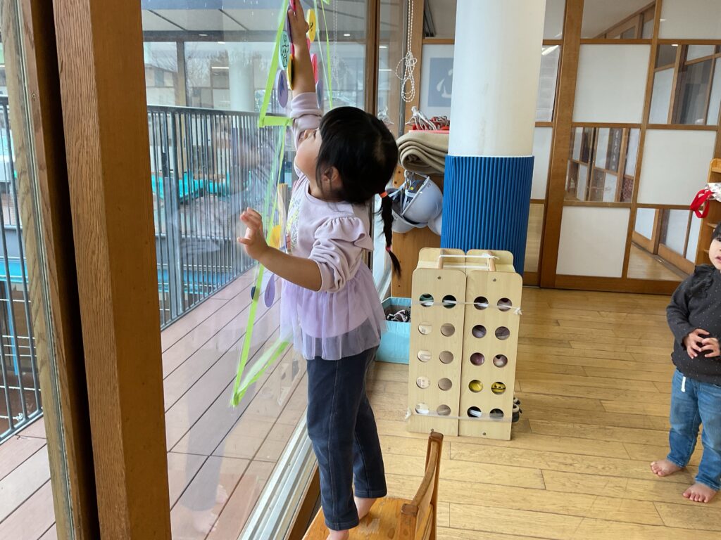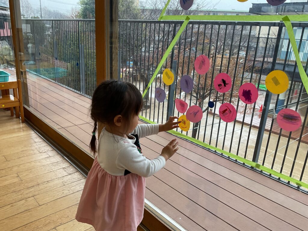 保育室の窓に貼ってあるクリスマスツリーに飾り付けをしてた子どもたち。好きな色画用紙にクレヨンで描いたり、顔を描く子もいました。友達同士で何を描いたか楽しそうに話していました。描いたものを自分で飾り付けして、「できたね!」と楽しんでいました。