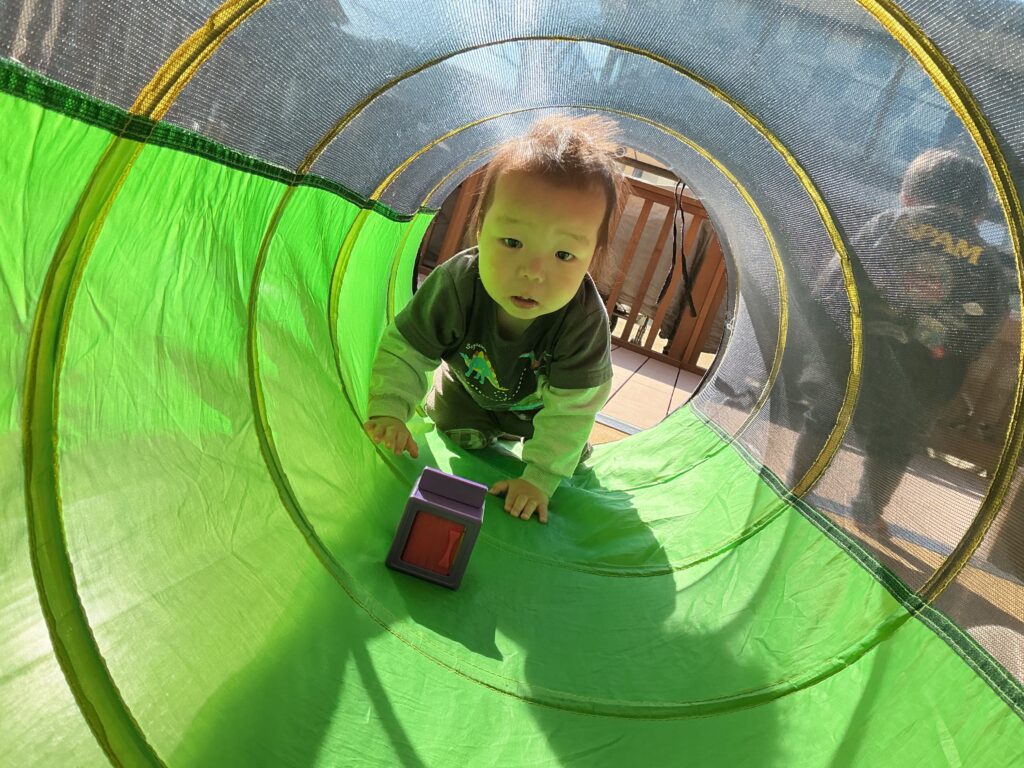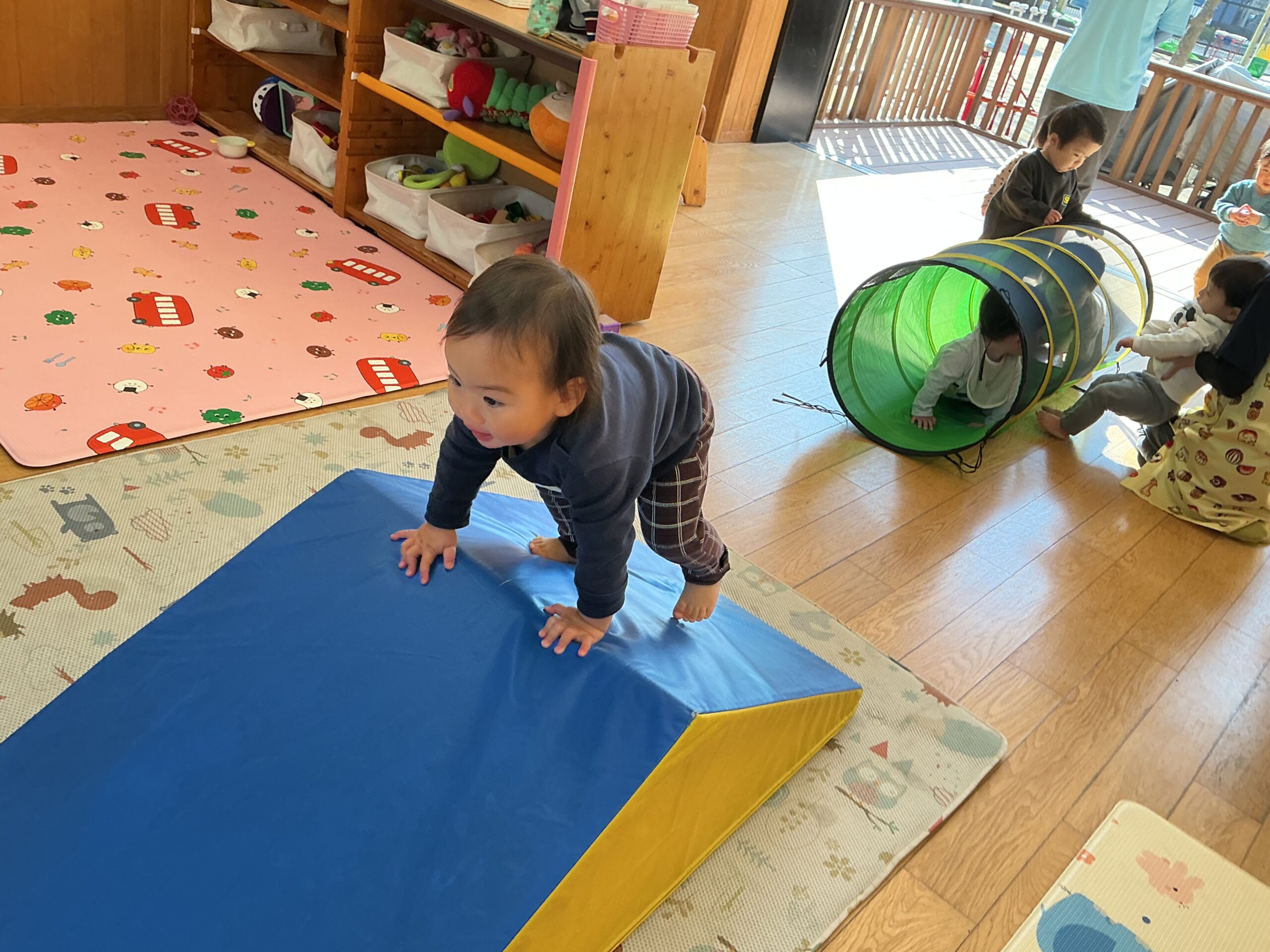 トンネルをくぐり、三角マットを超えて、最後は壁に「タッチー!」と言いながら何度も挑戦して楽しんでいました。