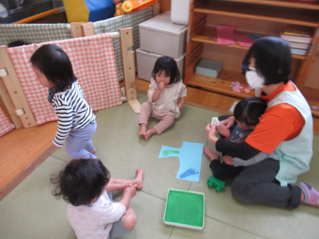 足形を取っている友達を見て「やりたい。」と言葉で気持ちを伝えてきた子がいたので、スタンプ遊びを行いました!自らスタンプ台に手や足をつけ、インクがついたことを確認していた純組さん。模造紙にペタペタと手形・足形をつけていきました。一人の子の発信で、みんなが楽しめる遊びに発展しました☆