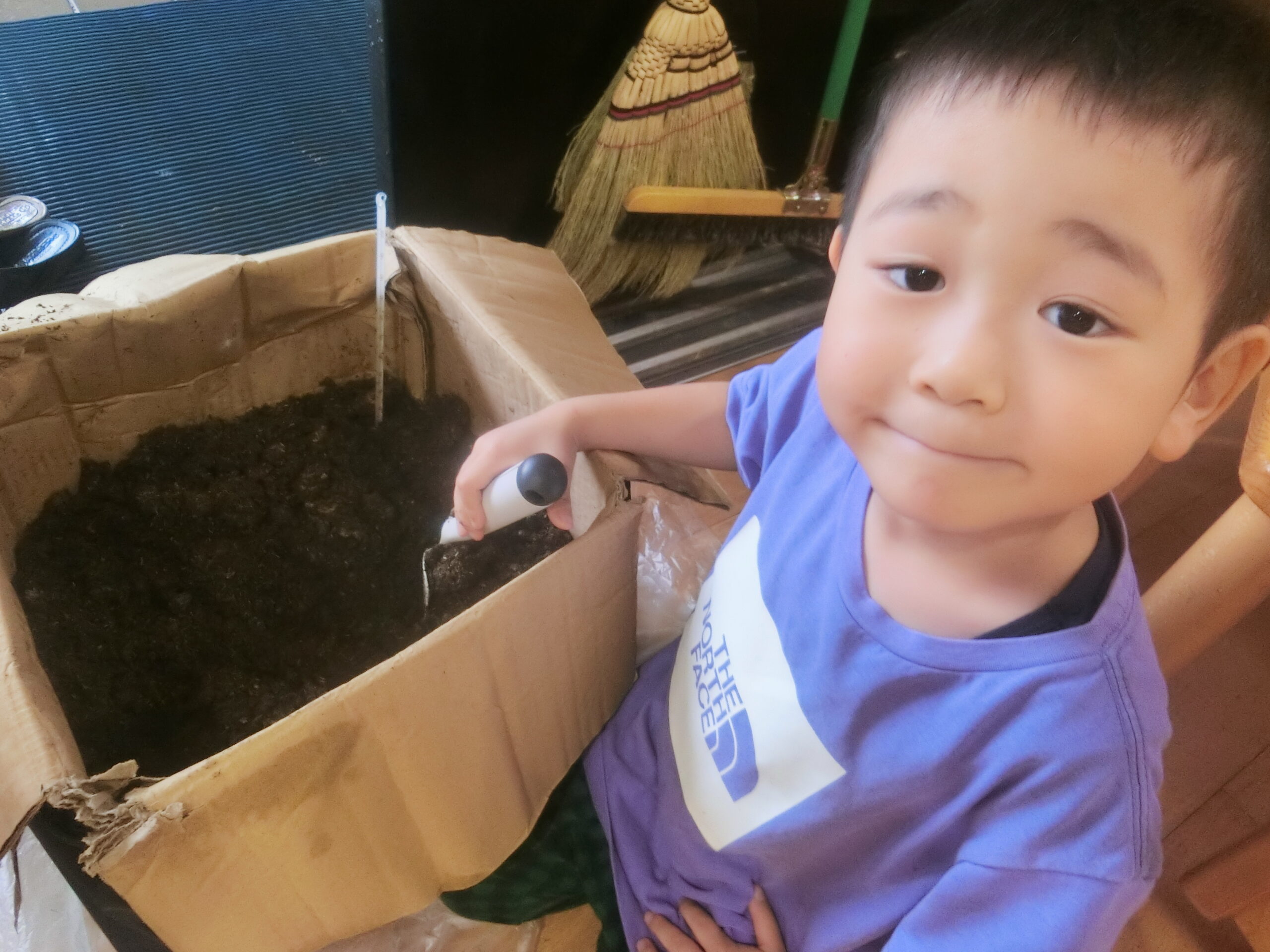 毎年SDGsの一環として行っているダンボールコンポスト。ゴミを減らすためにできることは何かと考えるきっかけになります。今日の基材の温度は50℃。手をかざすと温かさを感じました。給食の残食を入れるため台所にもらいに行くと、「こんなに余っちゃったの?」ともったいないという気持ちも持てたようでした。入れた残食はどうしてなくなるんだろう?と聞くと「バクテリアだよ!」と答えたり「温度が高いといいんだって」とよく知っている子もいます。様々な発見があるコンポスト活動。子どもたちも「やりたい!」と毎日興味をもって取り組んでいます。