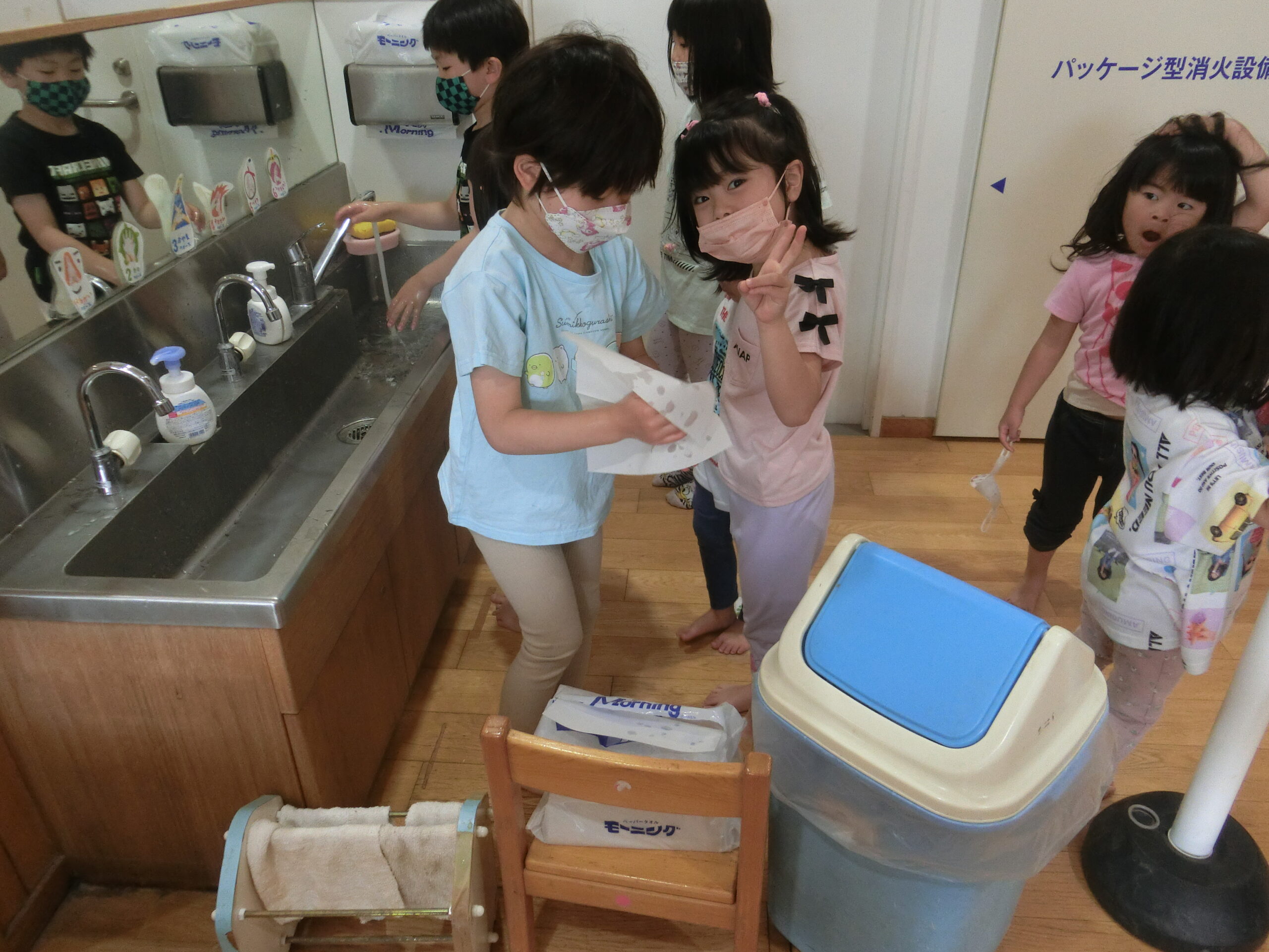 今日は空チームに手の洗い方や姿勢のマナー指導を行いました。最初に保育者のマナー指導の見本動画を見ました。子どもたちは「泡が残らないように綺麗に洗ってるね」、「廊下は走っちゃいけないね」などの意見を出し合っていました。その成果は直ぐに現われ、給食もおやつの時間もいつもより静かに姿勢正しく食べていました。来週は太陽と虹チームも行います。