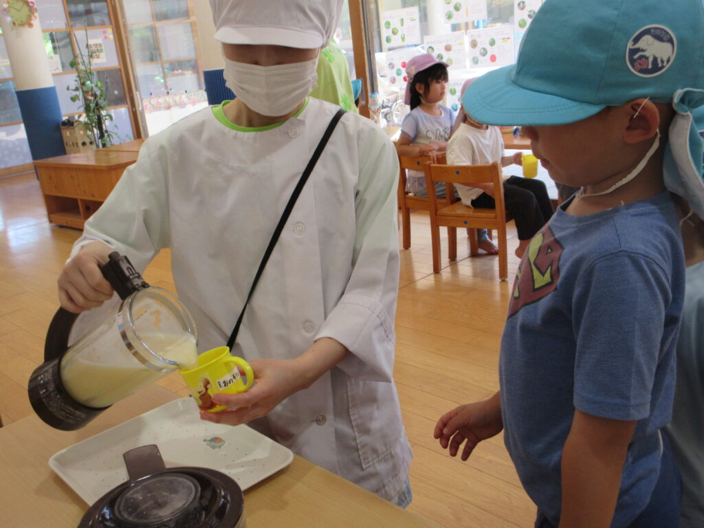子どもたちはミキサーでジュースを作るところを興味津々で見ていました。実際に飲んでみるとあまりのおいしさに「おいしい!」「つめたーい!」と大喜び。「今度は何が飲みたい?」と聞くと、「すいか」「にんじん」「リンゴ」と、嬉しそうに答えていました。