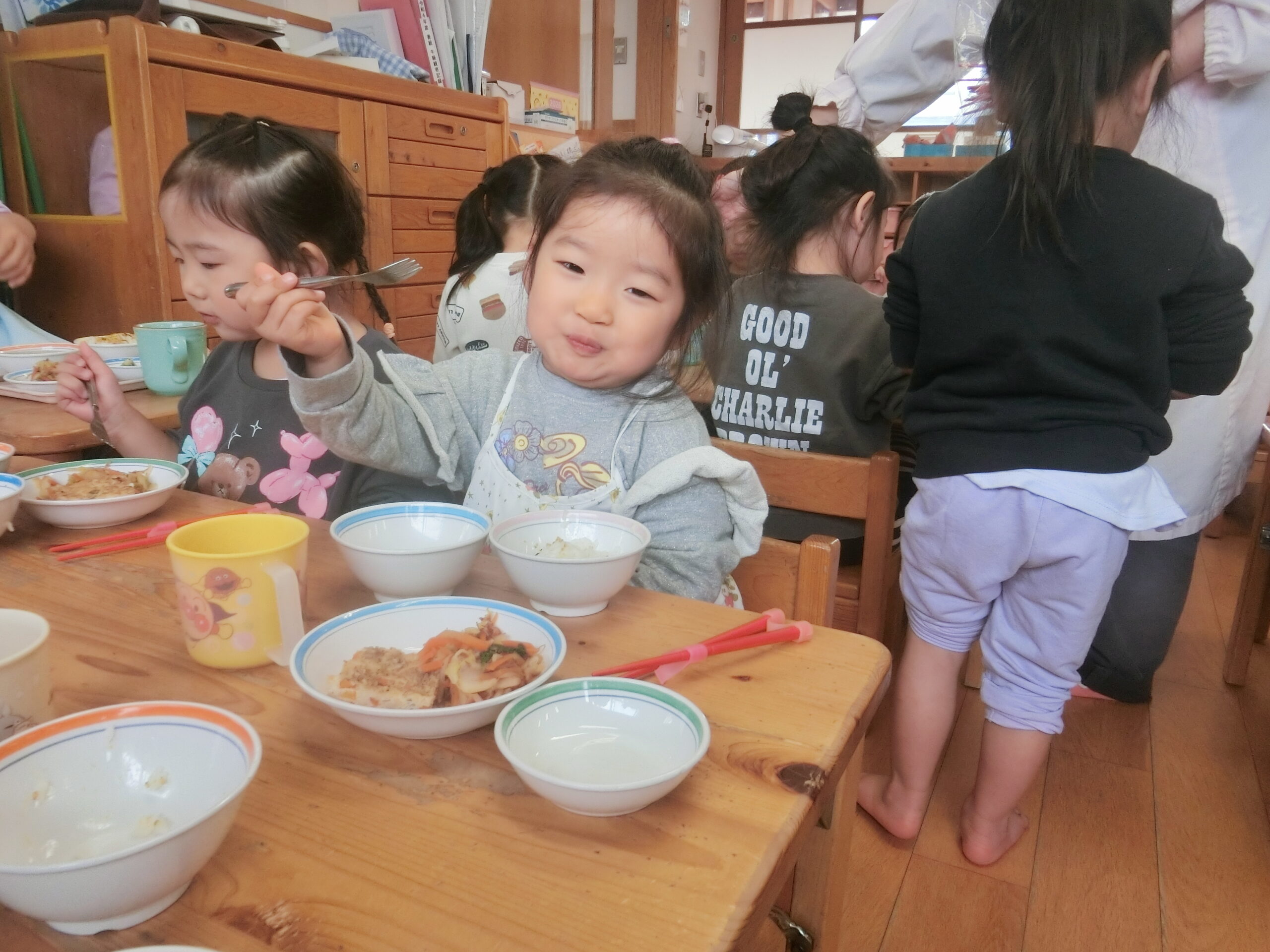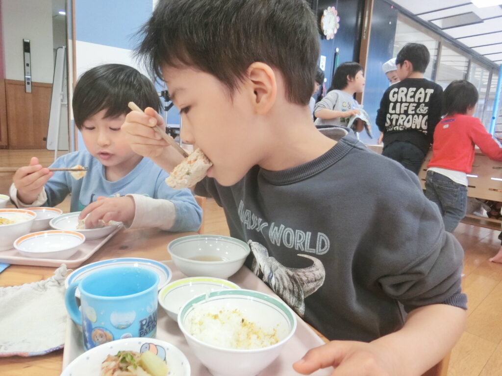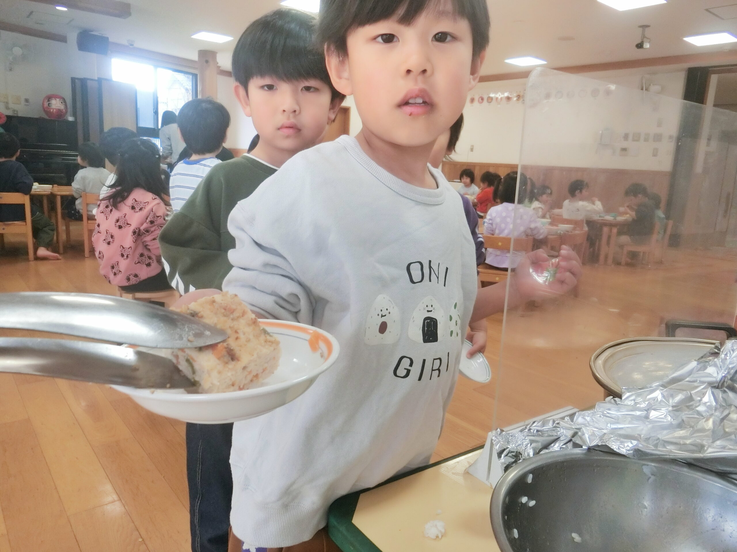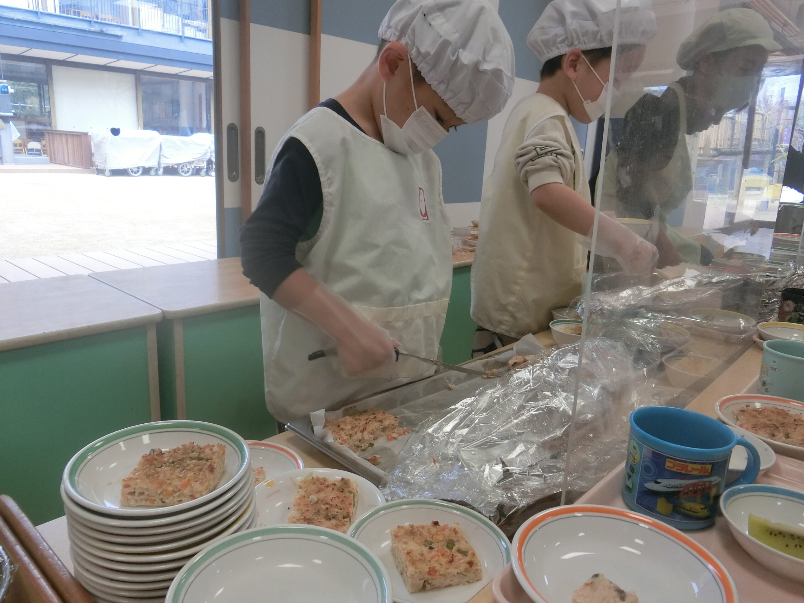 給食は松風焼きでした。鶏のひき肉を使い、ねぎ、にんじん、干ししいたけ、いんげんを細かく切って混ぜ、パン粉、みそ、砂糖を入れて味付けします。上からごまをパラパラとかけてオーブンで焼き、味がついているのでそのまま食べられ、鶏肉を使用した和風のハンバーグのような一品です。子どもたちにも大人気で、おかわりもたくさんしていました。
