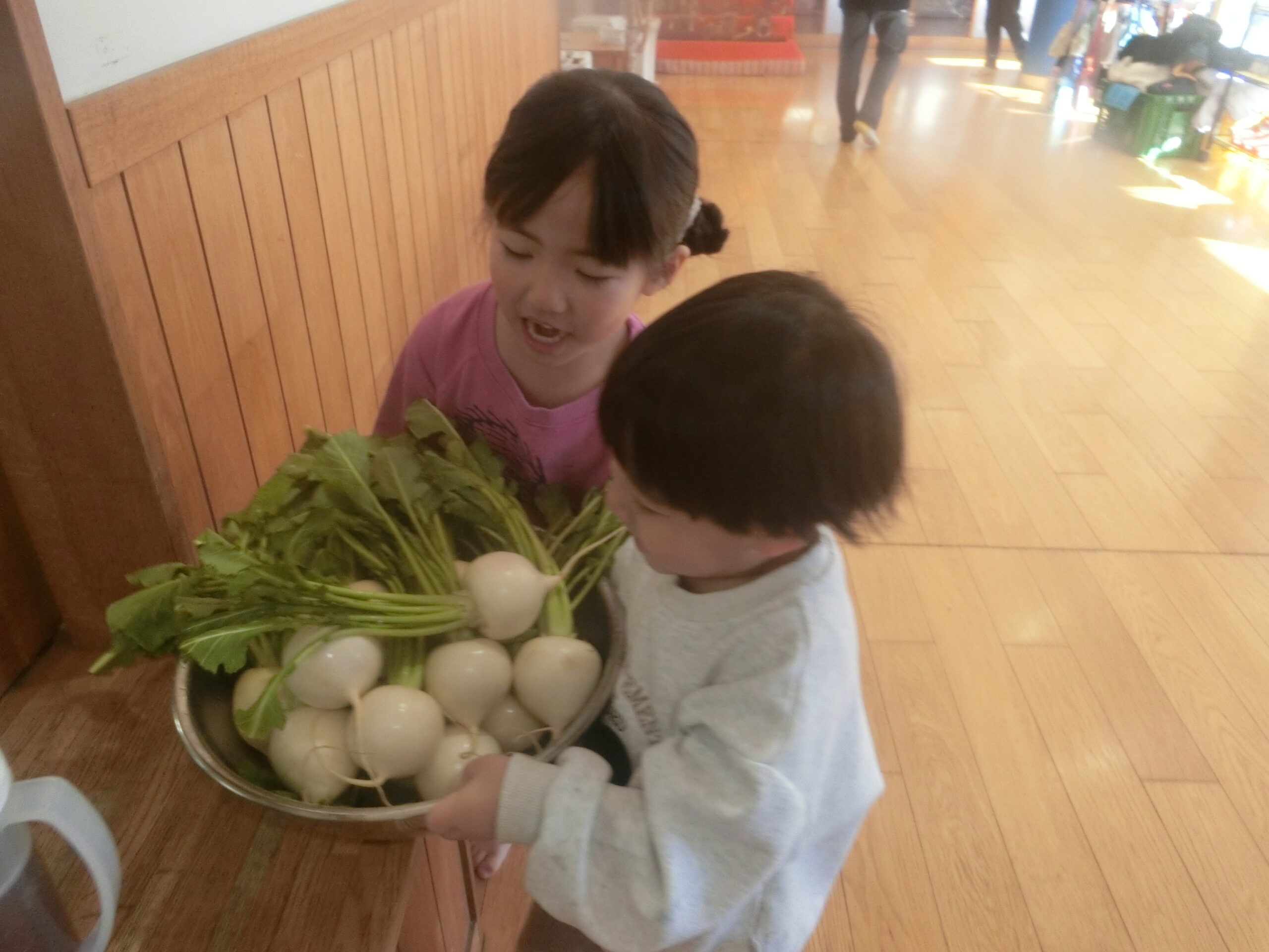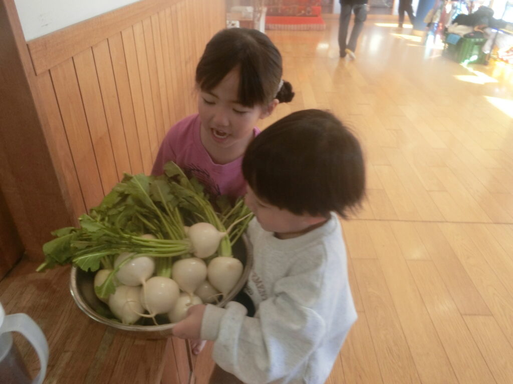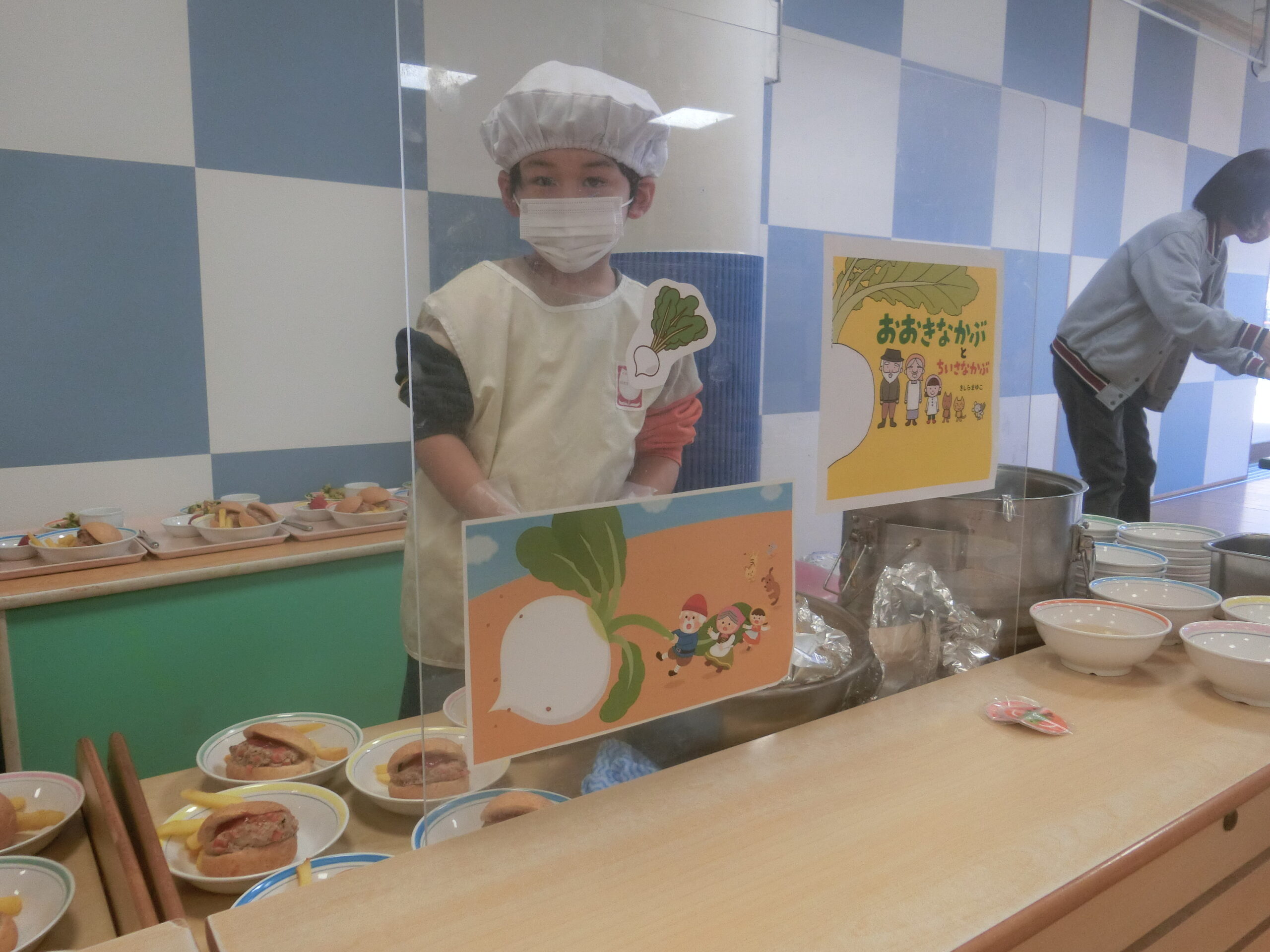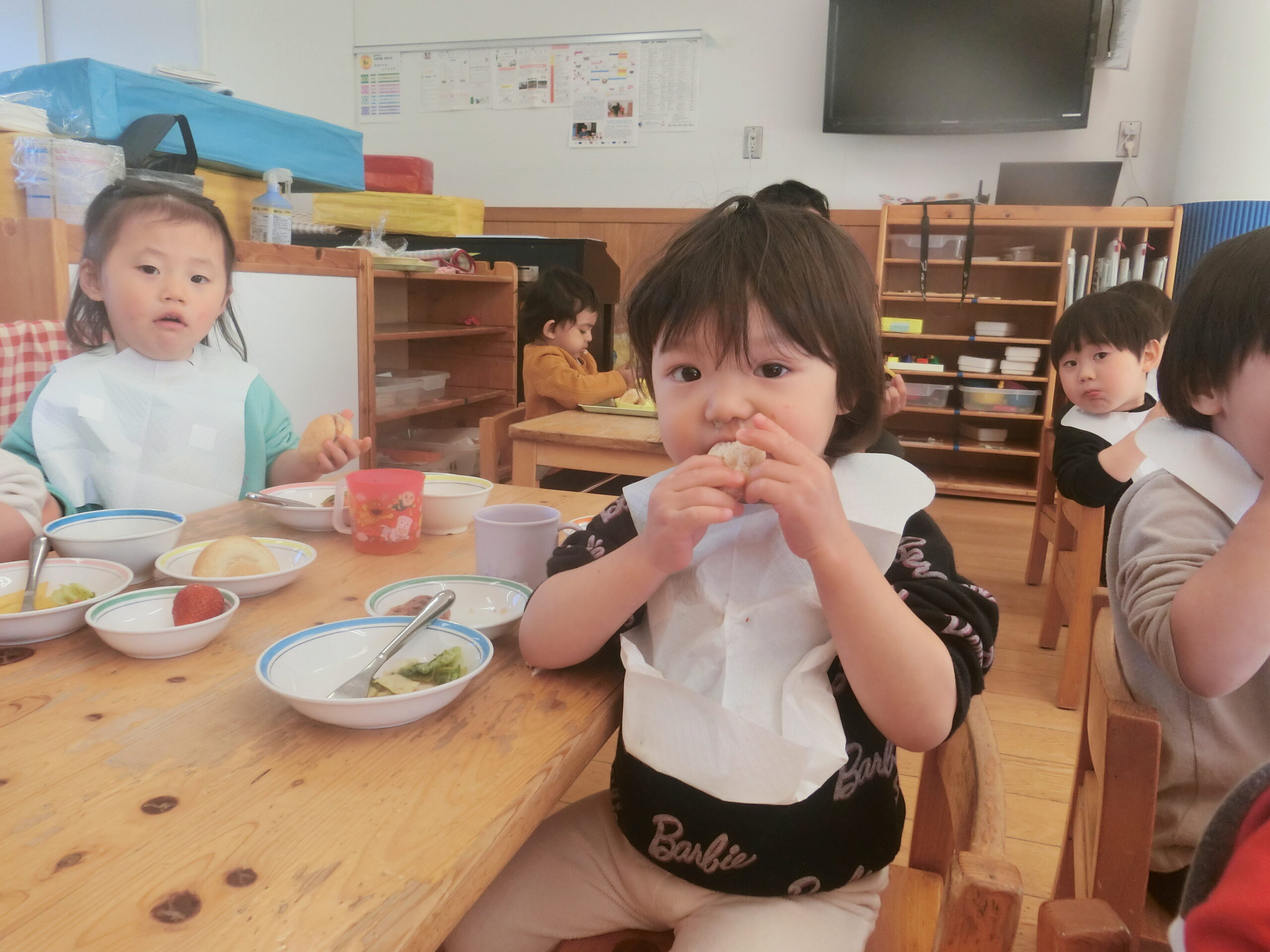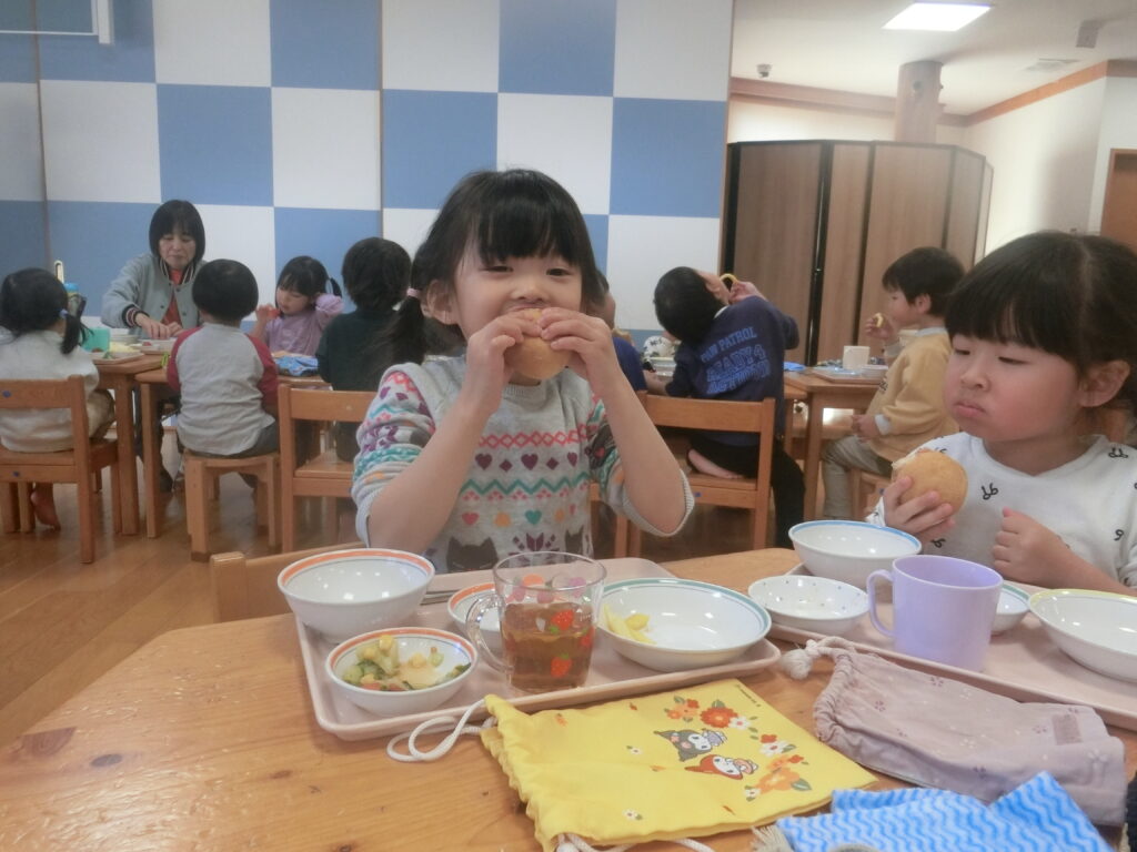 給食はみんなの大好きなハンバーガーとフライドポテト!子どもたちは大喜びでした。スープに入っているかぶは朝のお手伝いで子どもたちに洗ってもらいました。「おいしいね」と友達と一緒に楽しそうに食べていました。おかわりもたくさんして大満足な様子でした。