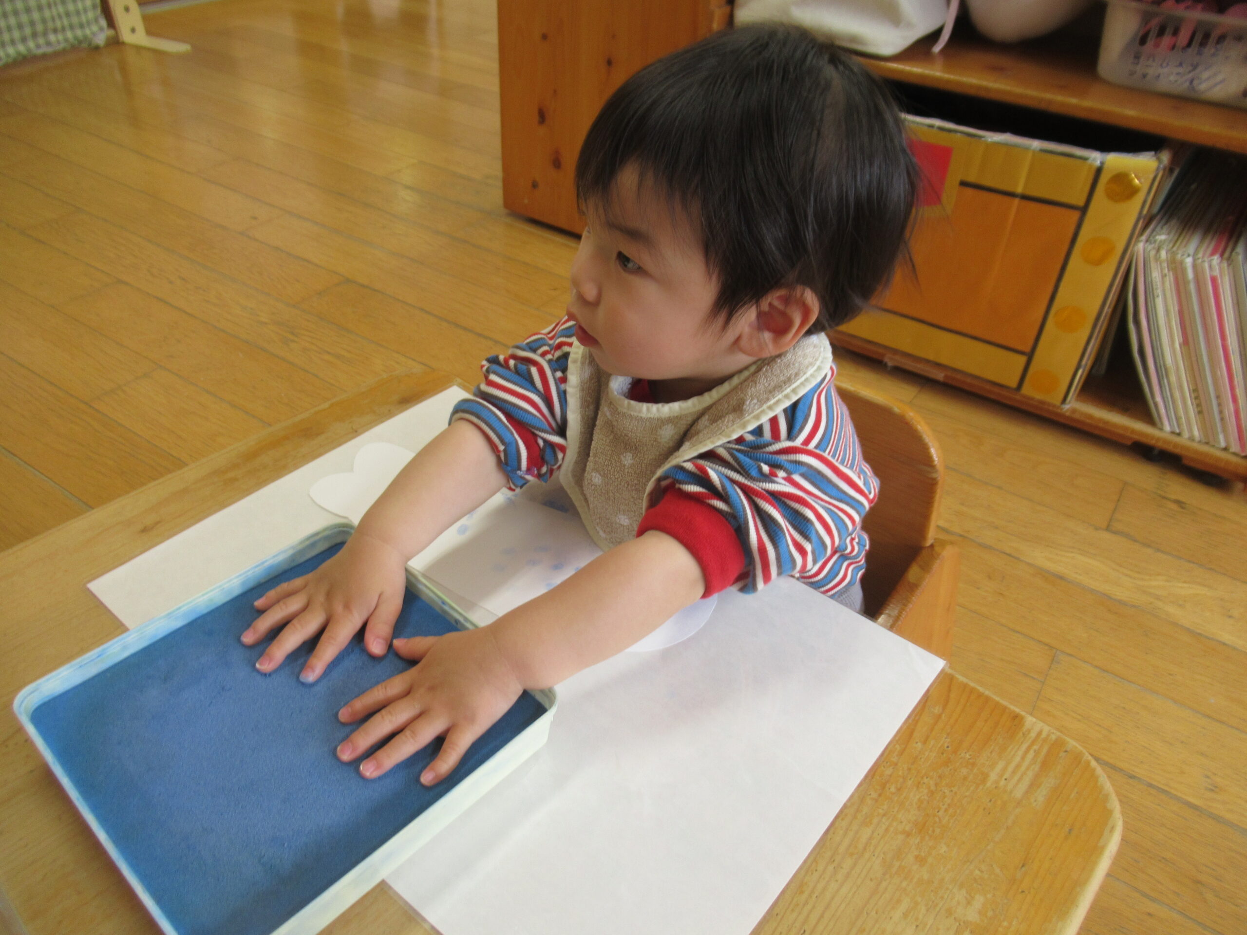 画用紙に「ペタペタ!」と力強く手を押し当て、スタンプを楽しむ姿がとても微笑ましく、