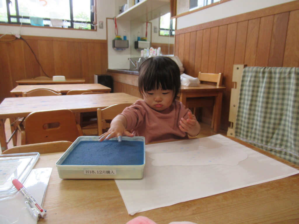こいのぼり制作を行いました。インクをつけた時の「ひんやり」とした感触に驚きつつも、興味津々な子どもたち。