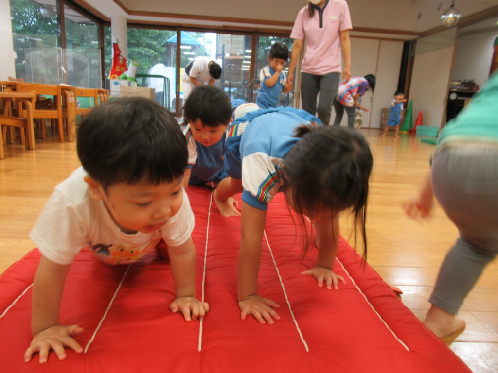 マットを出して大きいコーンを踏まないようにジャンプしたり、跳び箱の上も一人で登ったり、鉄棒ではコアラのように抱きつき、ぶら下がって楽しみました。
