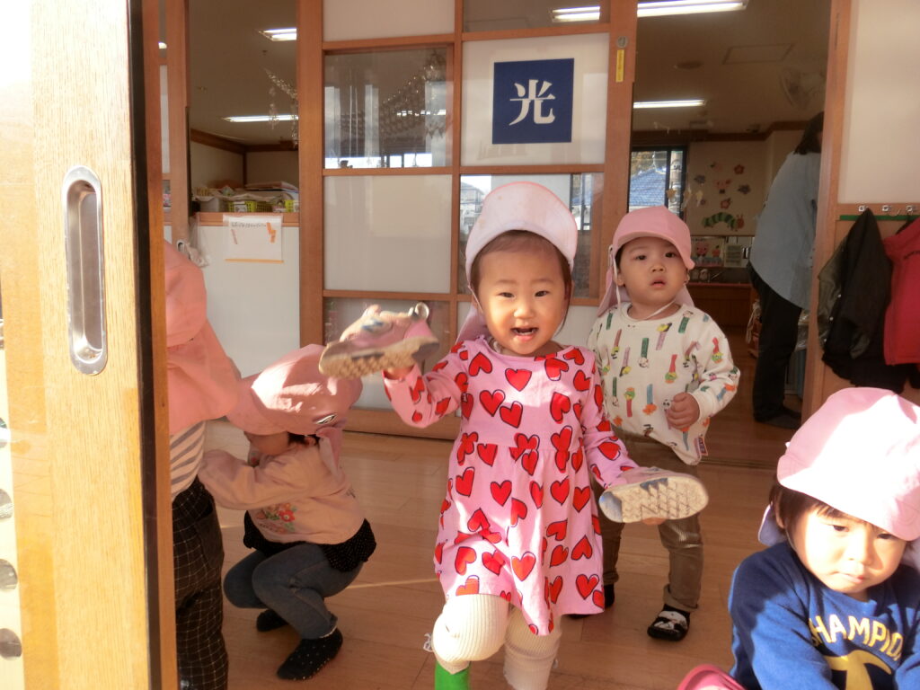 戸外遊びをするときには、靴箱から靴を持って「あったよ!」と声を掛けてくれる姿も見られます。