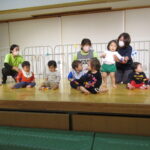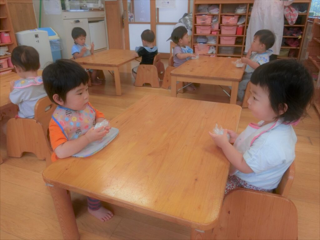 光組が植えたプランターの苗が大きく育ち実をつけ、とても立派ないんげんが採れました。明日の給食に使用しますが、何に入るかはお楽しみ。そのあと15時のおやつでおにぎり作りをし、最初は戸惑い気味でしたが「にぎにぎしてみて」と手本を見せると真似をして「できた!」ととても嬉しそうに見せてくれ、今日一日でいろいろな初めての食育活動をしました。
