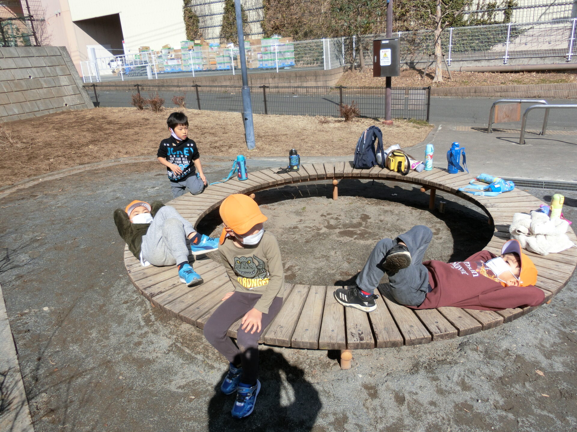 たくさん遊んだ後にはベンチで横になったり、友だちと座ったりして休憩をしていました。