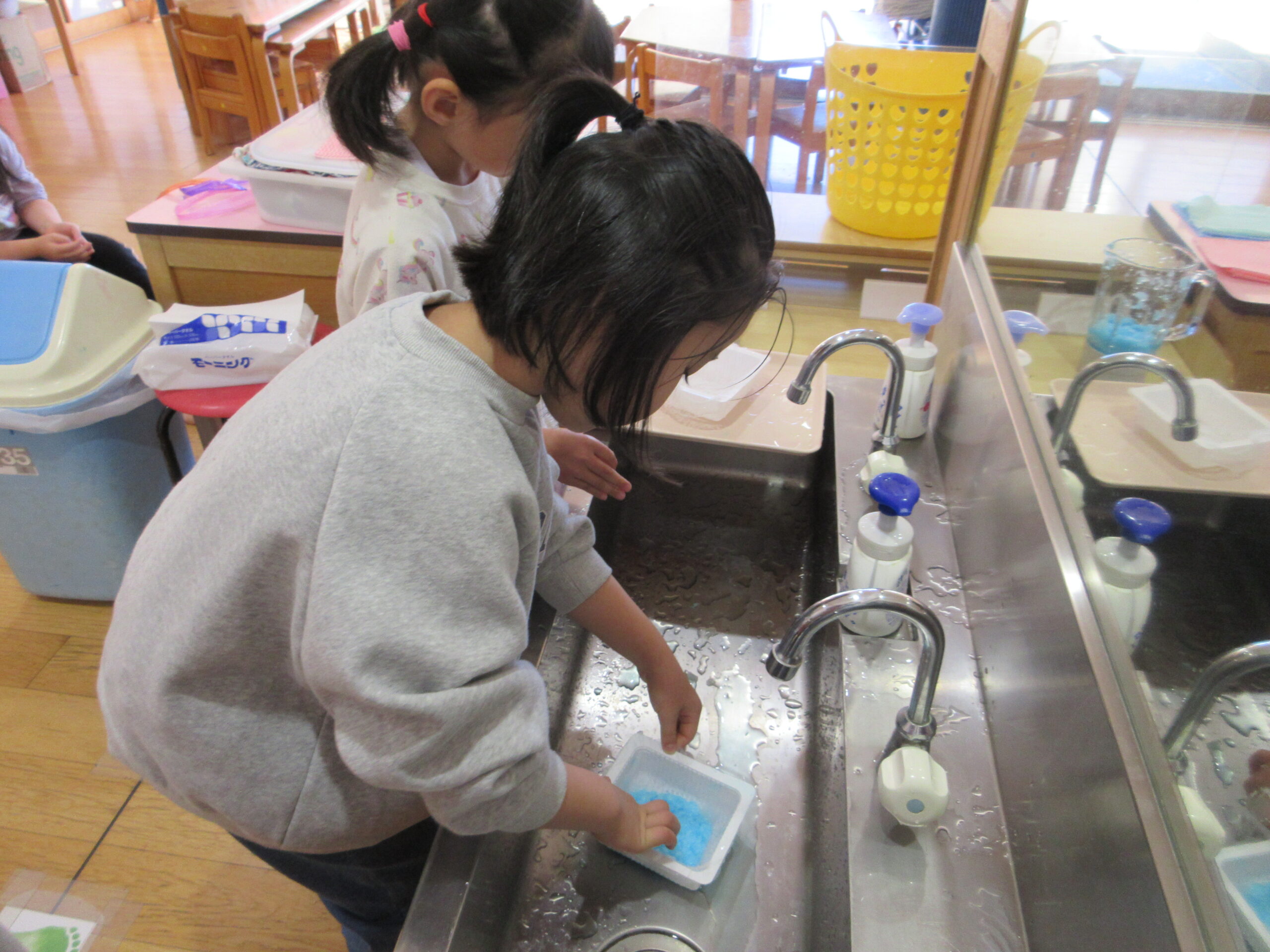 皆で協力をして小さくちぎり、更に細かくする為に水と一緒にミキサーの中へ投入…。その後平らにしてから水分をとばす為にネットに入れると、「早く乾かないかな~」「紙が出来上がったら、何に使おうかな~」と完成を楽しみにしている子ども達です。