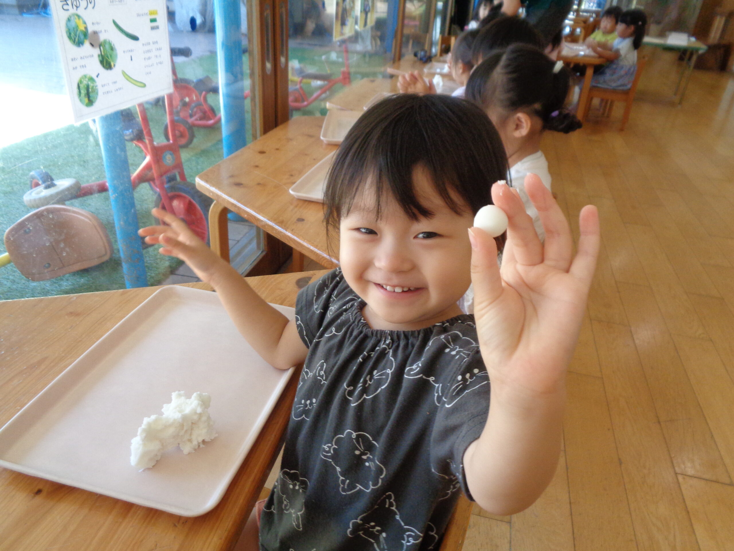 十五夜の由来とお団子の作り方の説明を聞いた後、お団子を丸めました。真剣に丸めている子や大きいお団子を楽しそうに丸めている子、出来上がると「先生見てー」と嬉しそうに伝えてくれる姿も見られました。