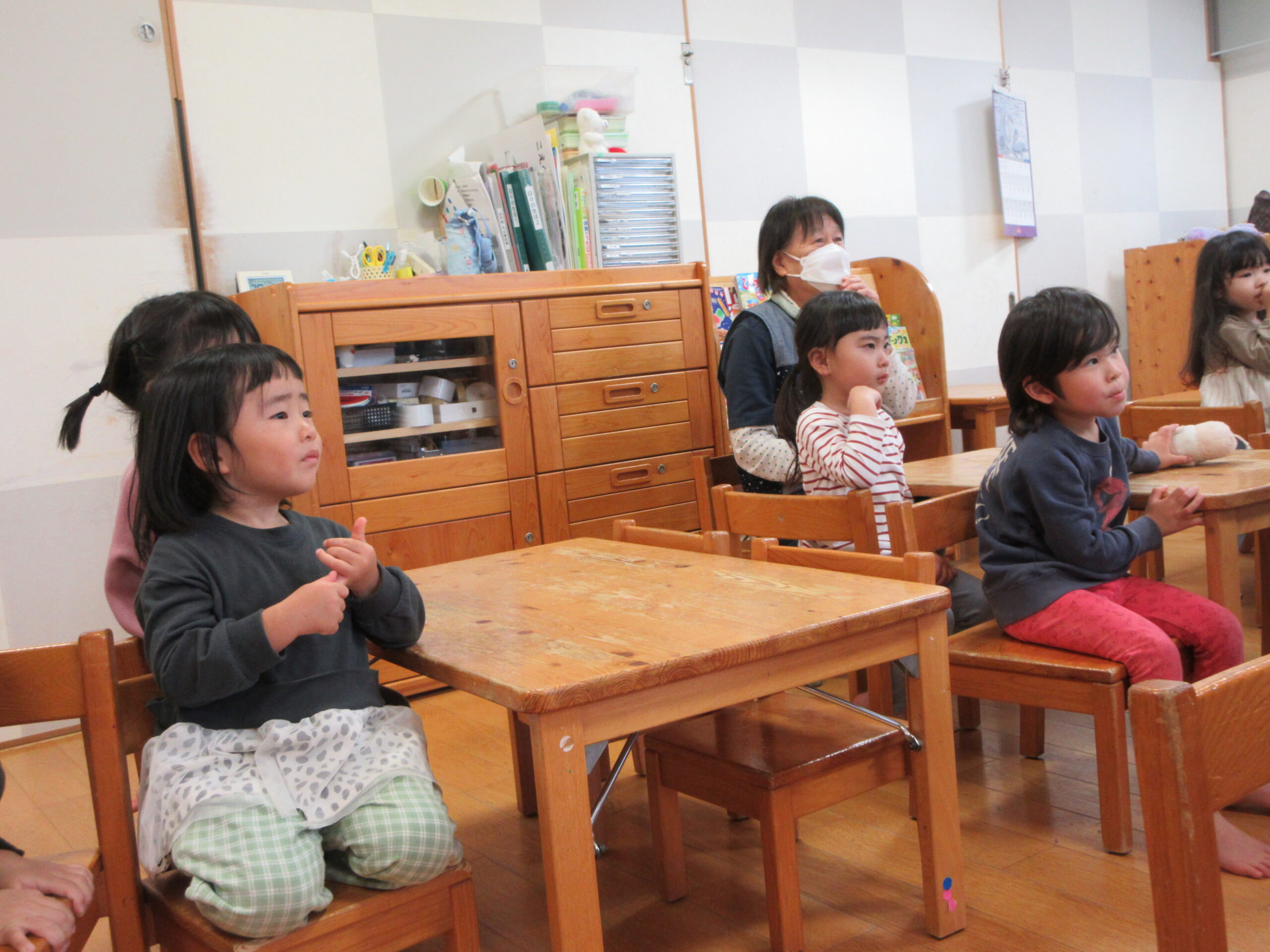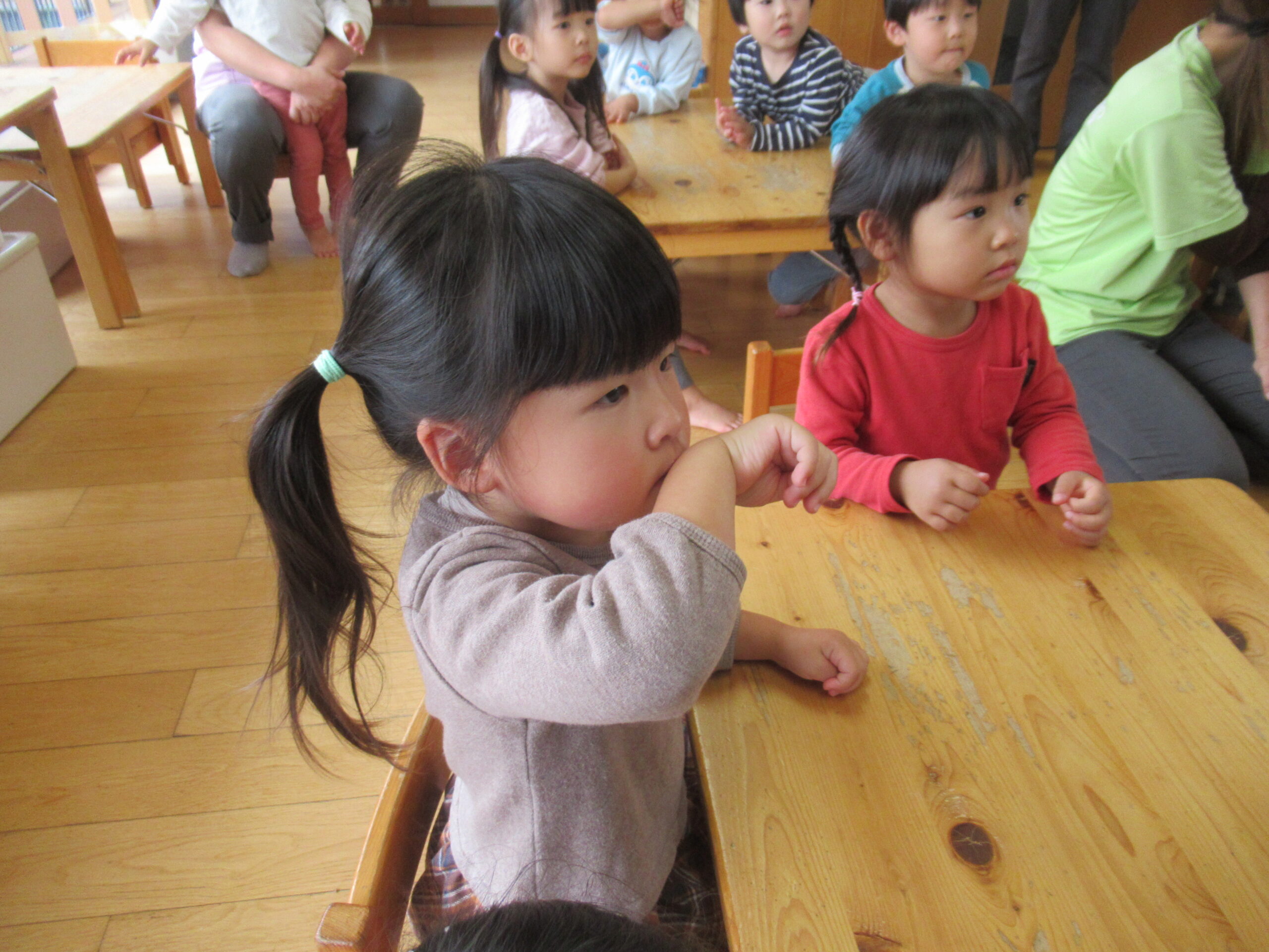 咳をするとばい菌が飛び散ることを、イラストを使って説明をしました。手で覆うと手についたばい菌が色々なところについてしまうので、袖やハンカチで口を覆う方法を伝え、実際に袖で口を覆ってもらいました。皆で病気を予防する気持ちのきっかけにつながってほしいです。