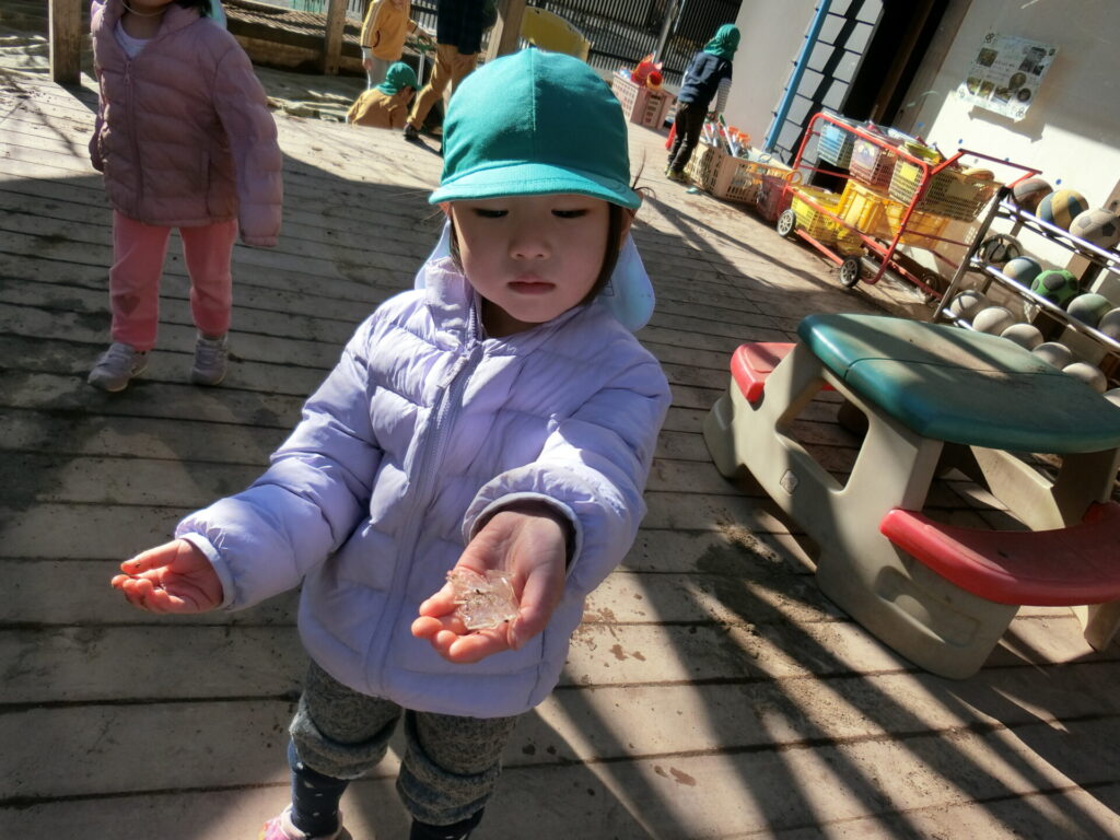 毎日園庭に氷があるか探しに行く子どもたち!今日も水たまりの中に氷が張ってあり大喜び★ 拾った後はどうするのか見ていると、「氷が解けないように!」と子供たちで考えて日陰に置いていました!明日はどうなっているかなあ?