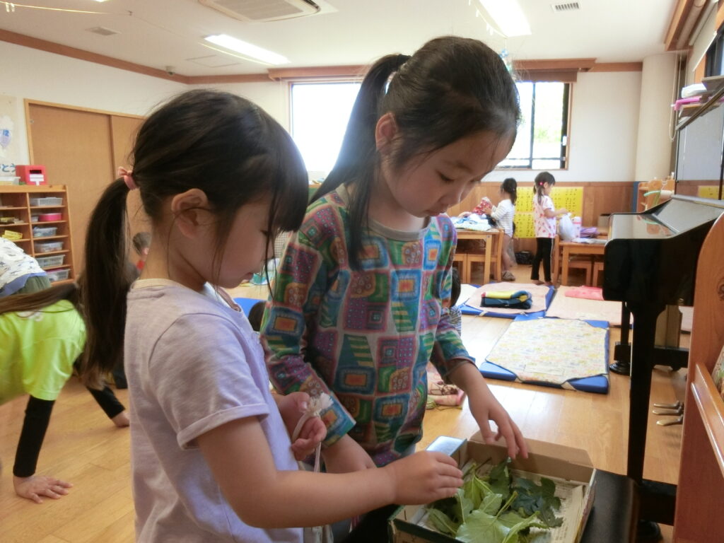 朝の会で見せると興味を持ち、のぞき込んでいる子がたくさんいました。蚕は桑の葉を食べるので、楢の里広場や楢の里の畑に生えていた桑の葉を子どもたちと一緒に集めました。集めている間も「いっぱいとろう」「食べてくれるかな?」と声が聞こえてきました。
