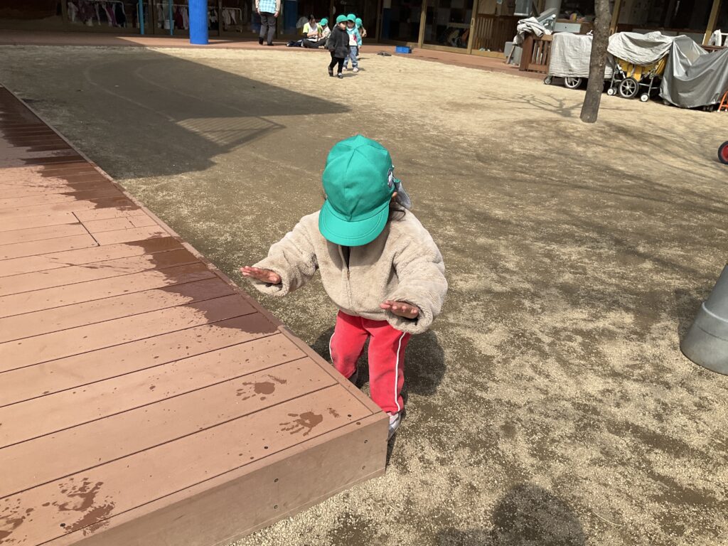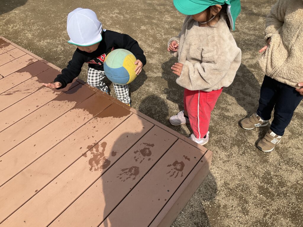 明け方の雨でできた水たまりをきっかけに、子どもたちの可愛い遊びが広がりました。ウッドデッキに残った水たまりを見つけた子が、そっと手を濡らして乾いた床にペタッと手形をつけると、まわりの子どもたちや職員も興味津々で集まり、次々にペタペタと手形を楽しんでいました。