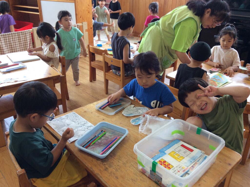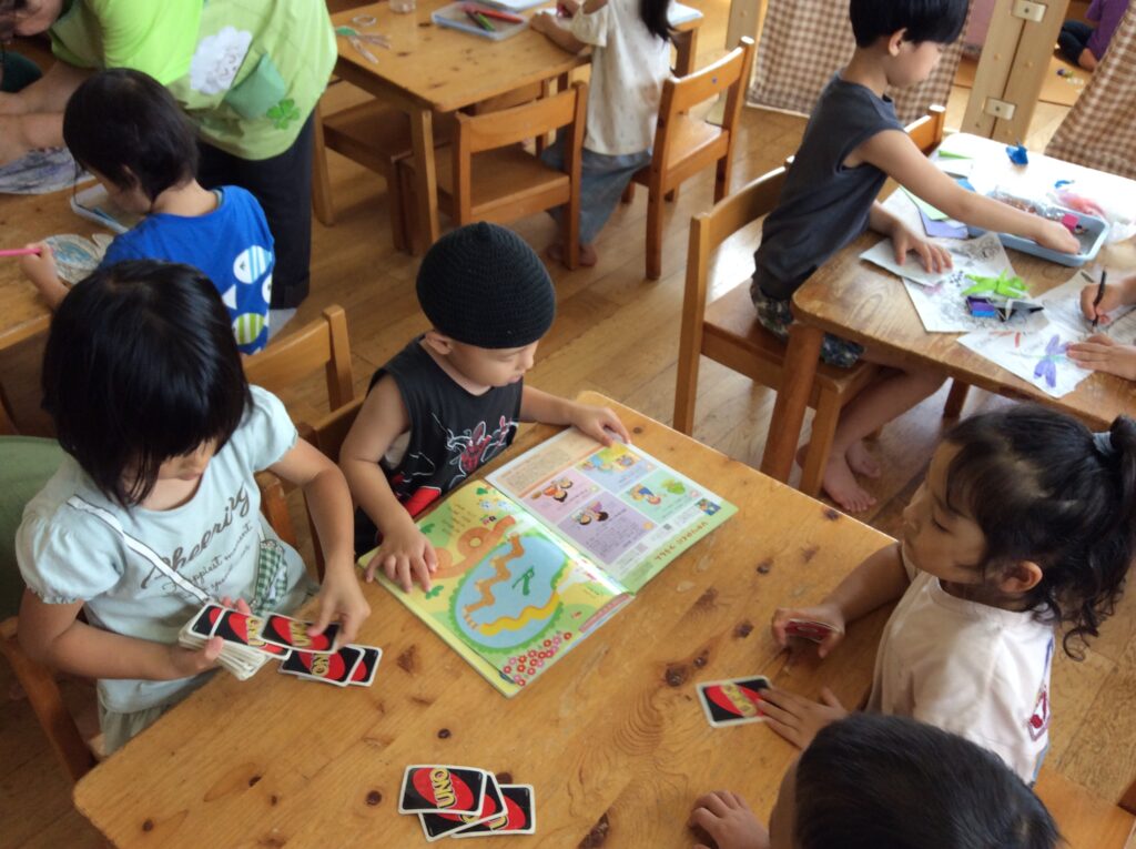 室内遊びを楽しみました。塗り絵では何色で塗ろうかと悩んだり、昆虫の塗り絵をしながら折り紙で昆虫を作ったり、UNOで勝負をしたりと好きな遊びを思い切り楽しむことが出来ました。遊びを楽しむ中で友だちと話し合ったり協力したりと、友達との関わりも楽しむことが出来ました。