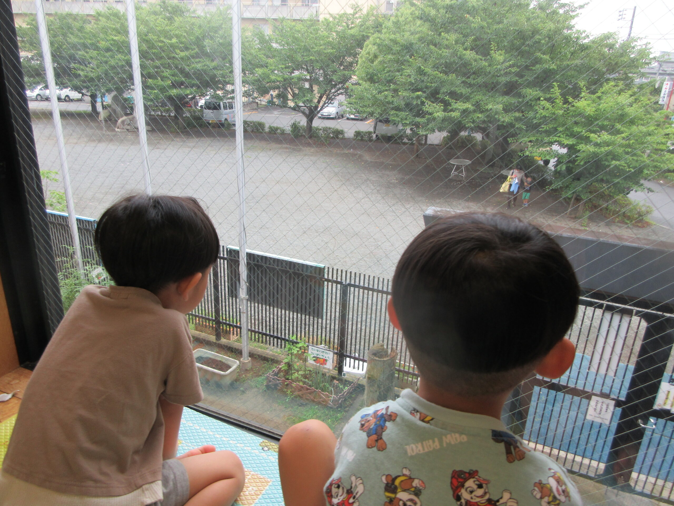 窓の外を見て「雨降ってるね」「お外行けないね」と話していた幼児組ですが、保育室の中では友だちとすごろくを楽しむ姿や、昆虫の塗り絵をカラフルに塗って切り取る姿が見られました。