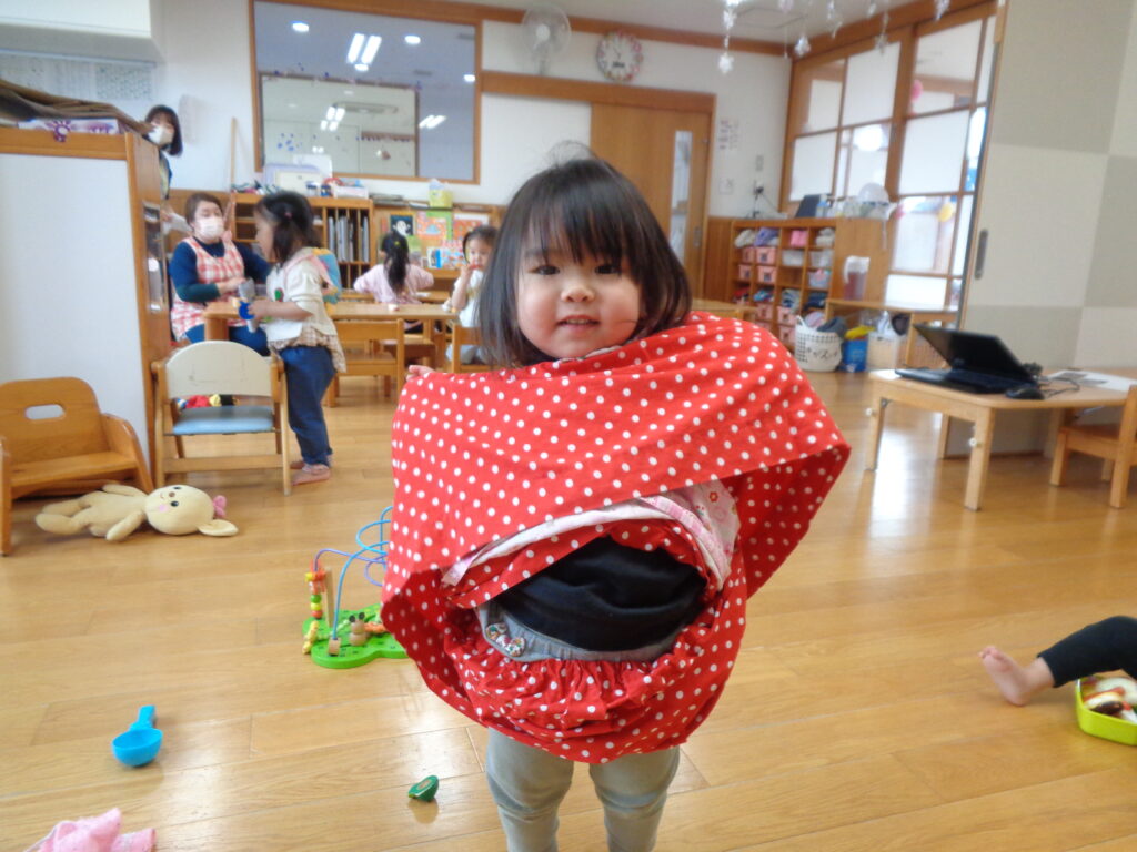 夢中になって遊んでいる姿を発見!覗いて見るとくまの入れ物の中に小さな玩具を入れたり、ぬいぐるみにご飯をあげて見立て遊びをしたり、「着替え一人でできたよ」と自分で好きな衣装に着替えたり、それぞれの時間を楽しんでいる光、輝組です。
