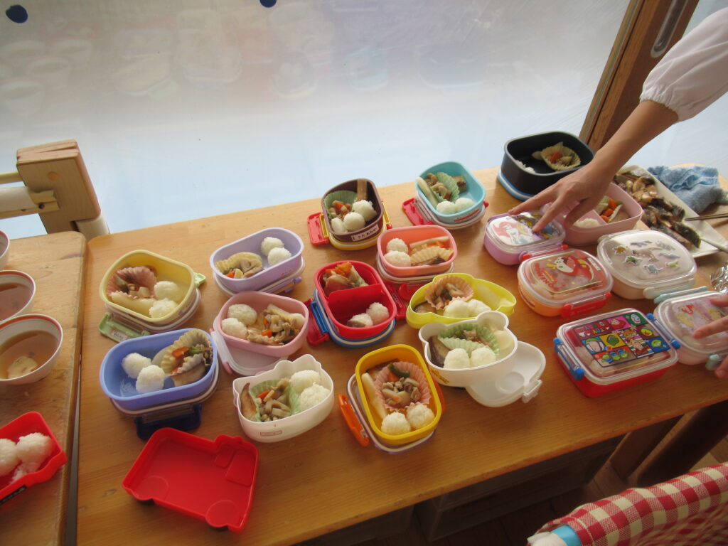 今日は心・善組で弁当箱に給食を入れてお弁当給食を行いました。