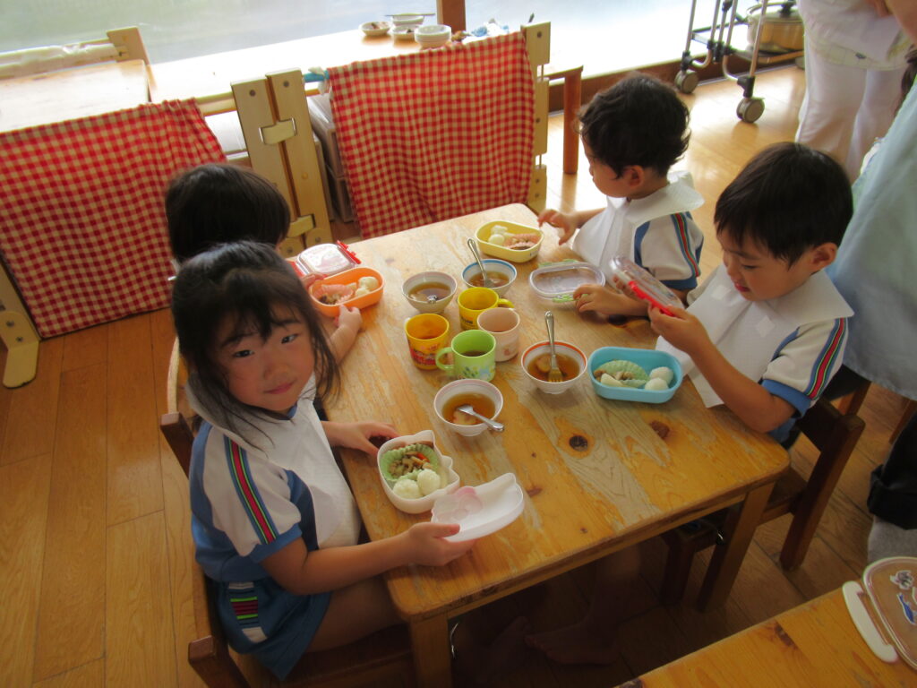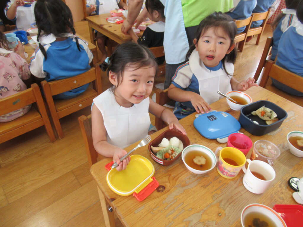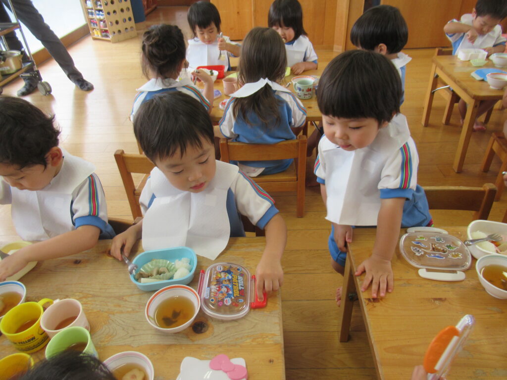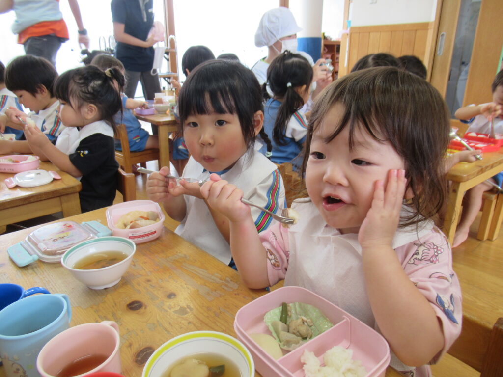 「ピカチュウの弁当箱なの」「アンパンマン弁当だよ」等ご家庭で用意してくれた弁当箱を友達に教えたり、友だちのを除いて見たりして心・善組で楽しい給食の時間を過ごしました。