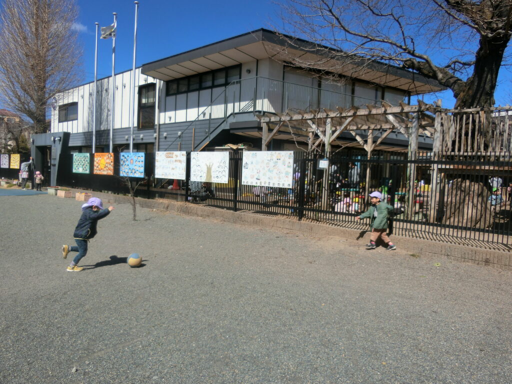 上着をきちんと着て楢の里広場で、「ここをゴールにしよ」とフェンスをゴールに見立ててサッカーをしたり、友だちと一緒に追いかけっこやホッピングなどで楽しんだり、暑くなると上着を脱ぎ体を動かして遊んでいました。