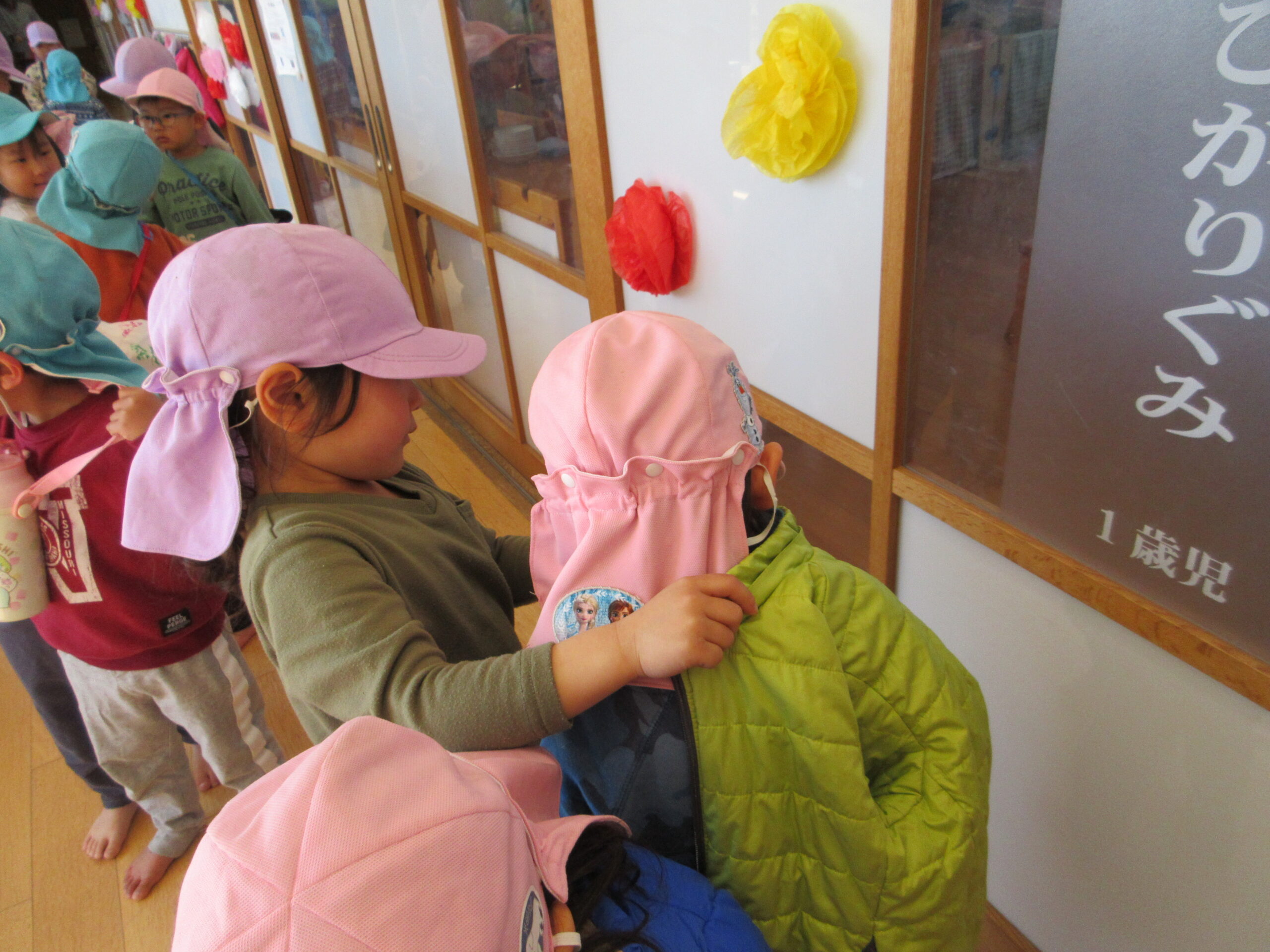 戸外に出る時の身支度で、2歳児が上着を着れないでいると「お手伝いしてあげるよ」と和組や愛組の子が優しく上着を着せる手伝いをしてくれました。