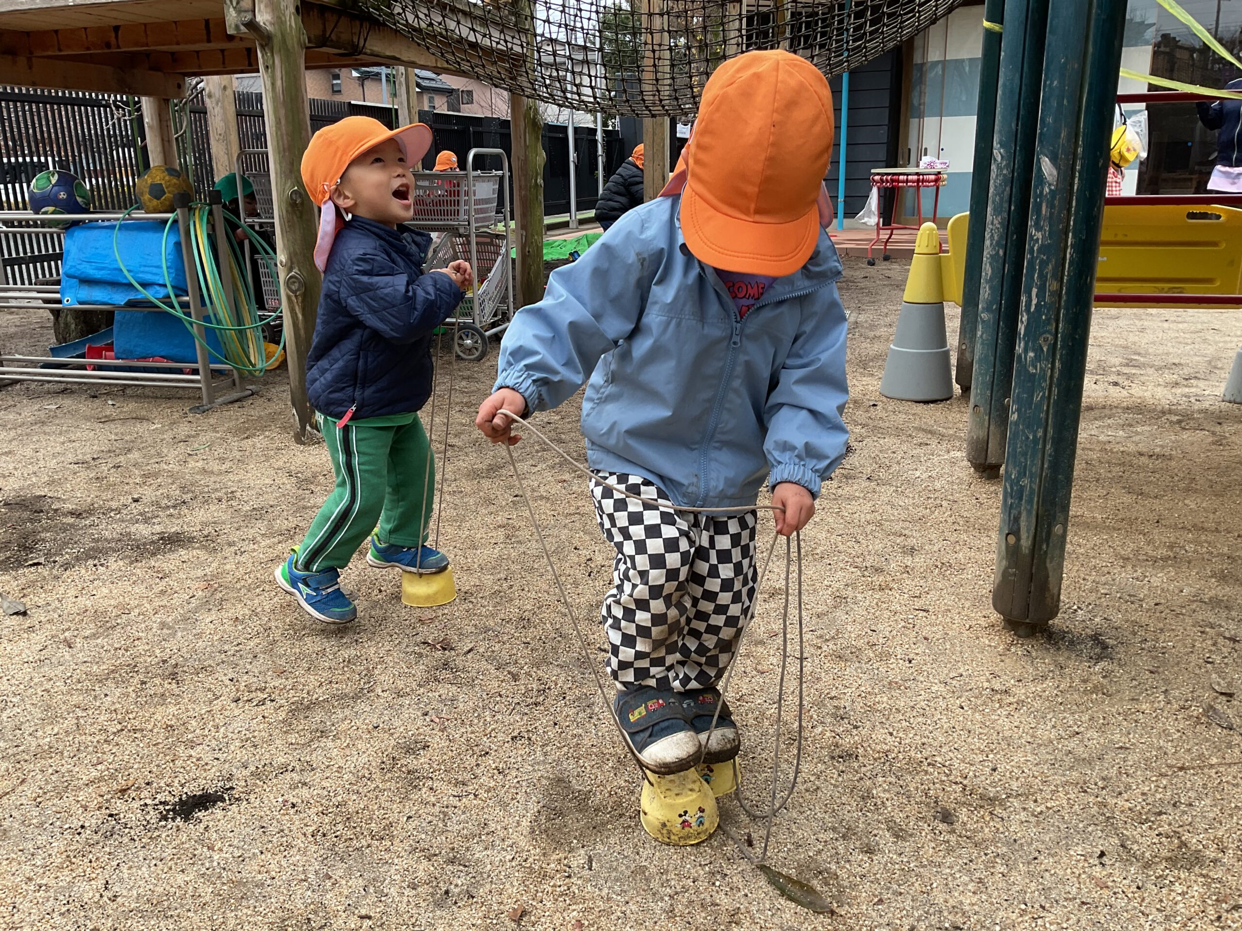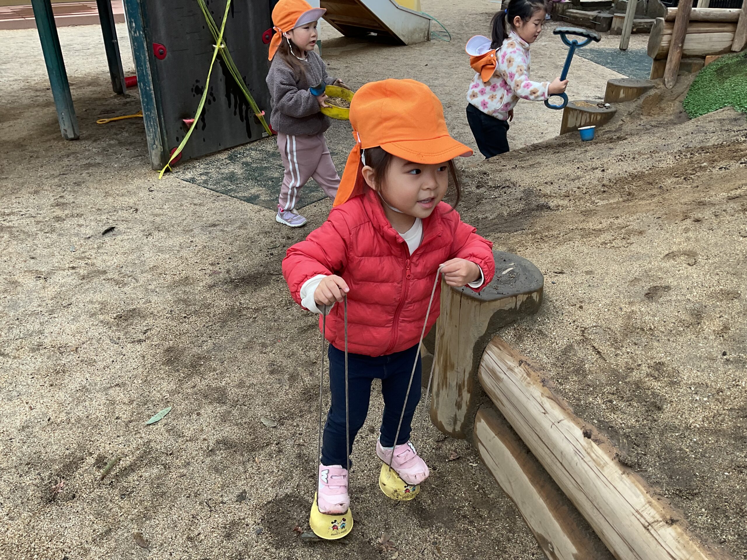 戸外遊びでは新しい遊びを見つけて、日々自分たちで遊びを発展させる様子が見られます。ぽっくりに乗って何回も踏み外したりするけど、乗れるまで諦めない気持ちで練習していました。最初は「難しいよ」と言っていたけれど何度も挑戦していき、保育者に嬉しそうに「できたよ」と伝える様子が見られました。子どもたちの遊びを通して成長が見られ、これからもいろんなことにチャレンジする気持ちを大切にしていきたいと思います。