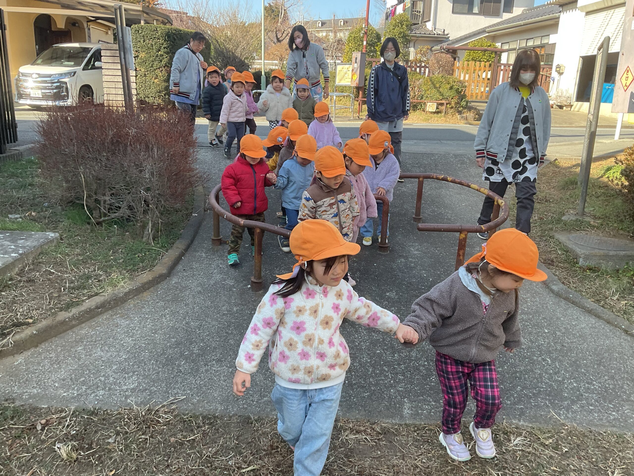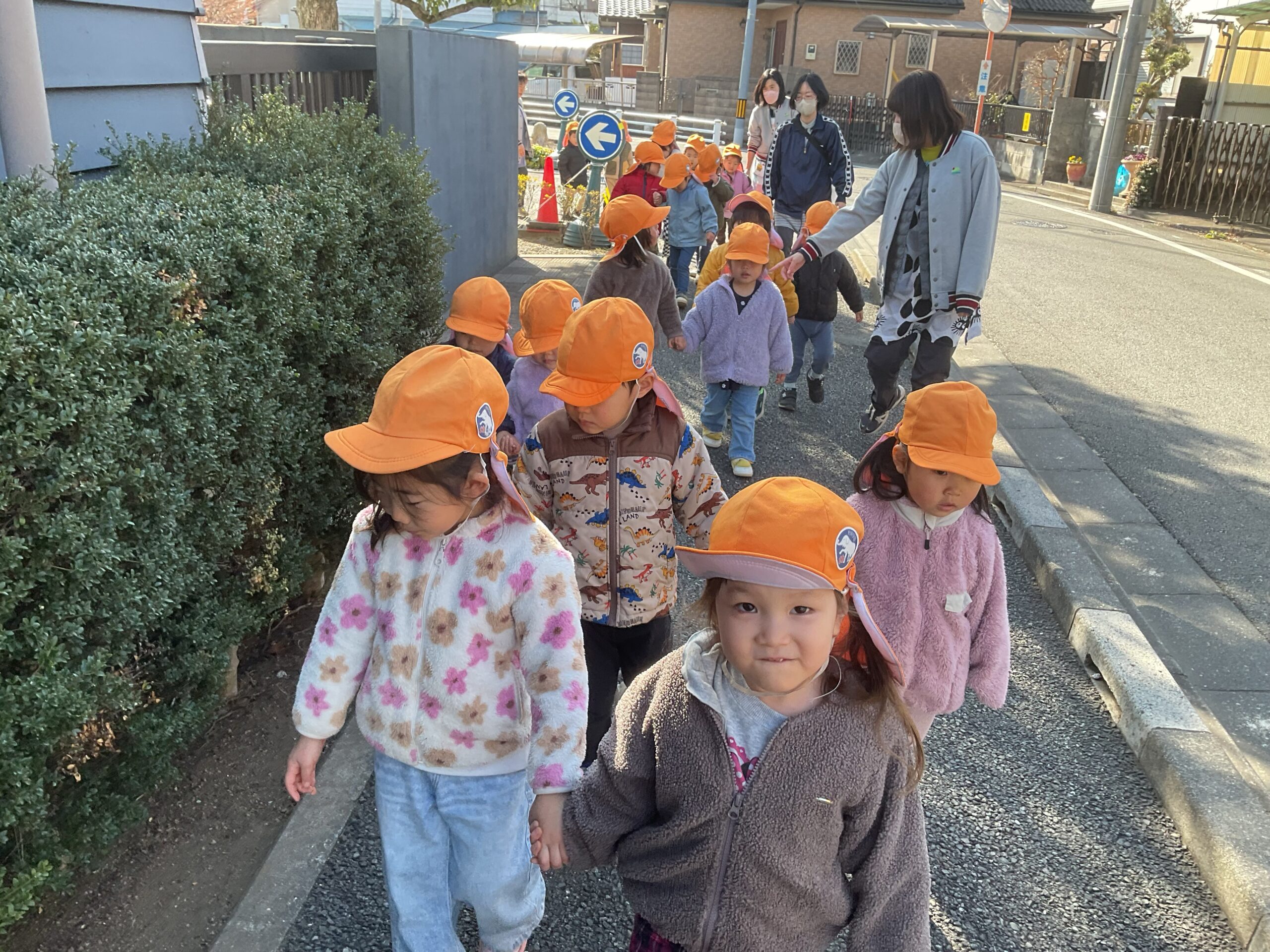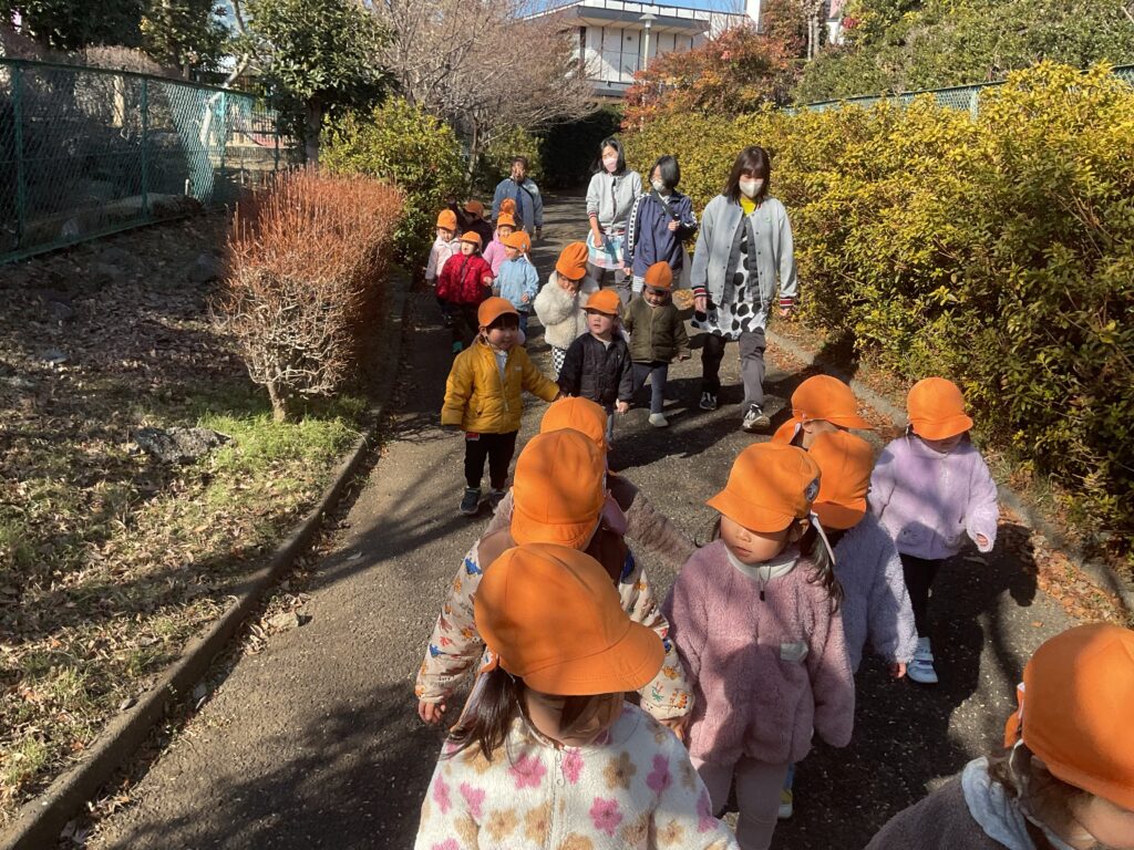 冬の寒さも感じながらも、日向は暖かくて気持ちの良い冬晴れの中、友達と手を繋いで散歩に出かけました。友達と小さな手をぎゅっと握り「あっ!葉っぱあったよ。」「バイク通ったね!」と発見を楽しみながら歩く姿は微笑ましいです。友達と一緒だから、寒さも忘れて元気いっぱい!歩くことが楽しい遊びの時間になっています。