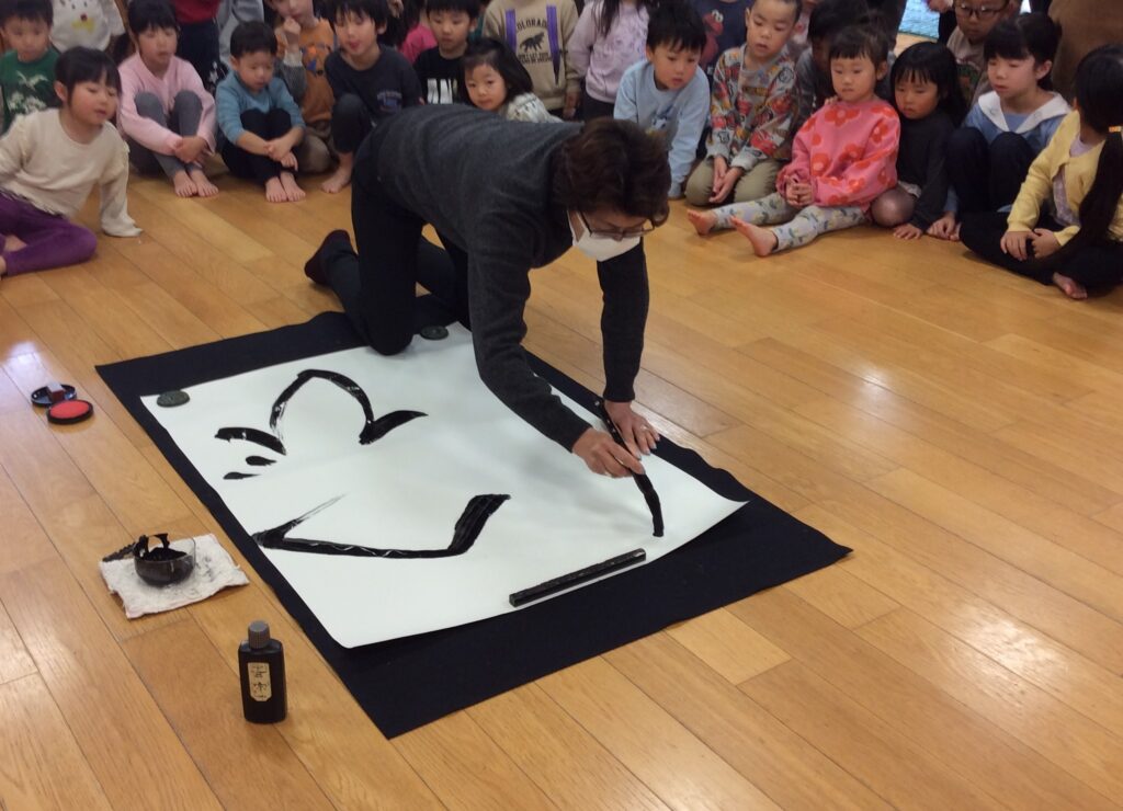 代表園児によるだるまの目入れや「十二支のはじまり」の紙芝居、「十二支の歌」をみんなで歌い、新年をお祝いしました。毎年恒例の書き初めでは、園児のおばあさまが披露してくださり、「すごい」「上手!」とみんなが感嘆の声を上げるひとときでした。