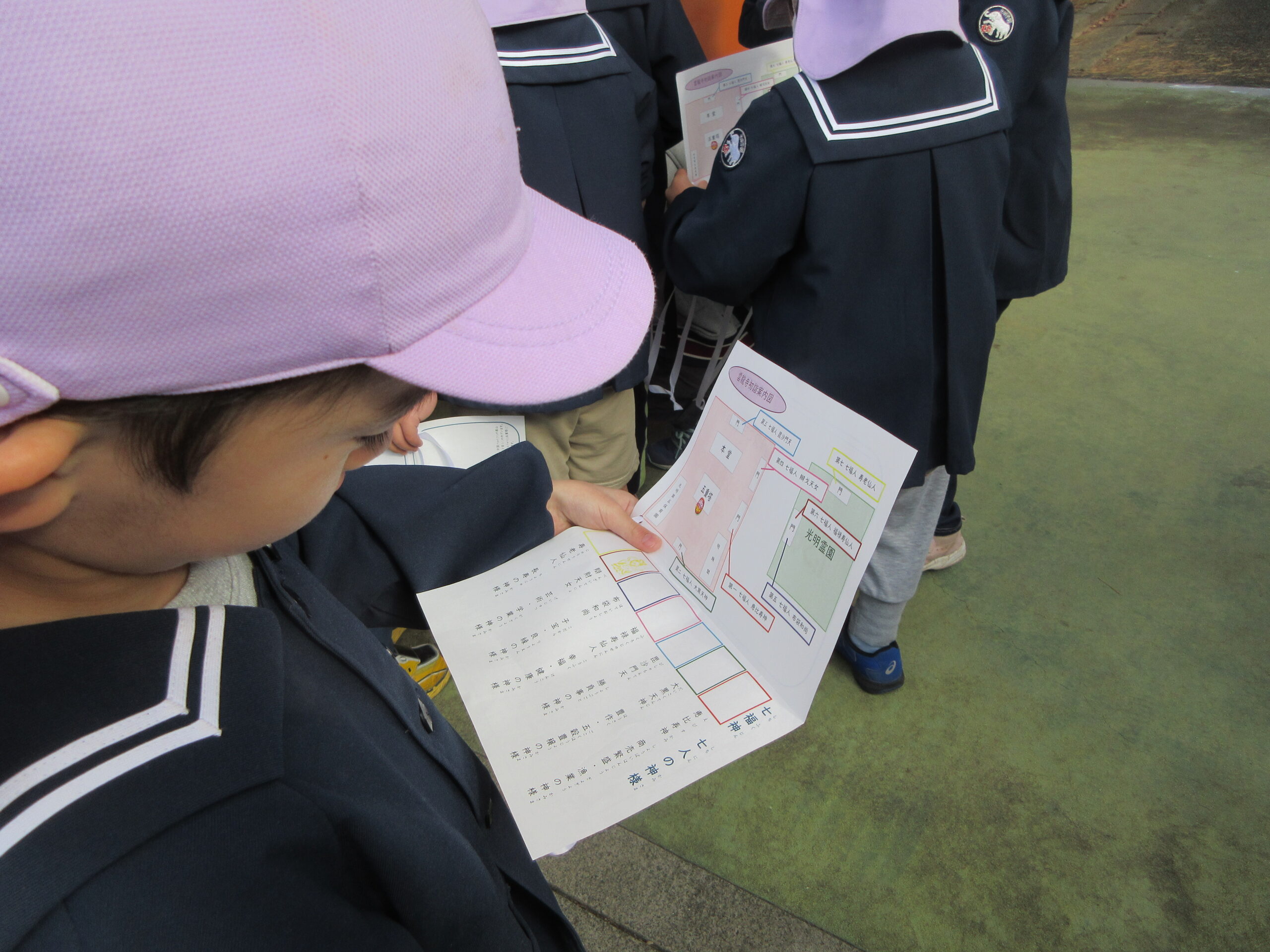 七福神巡りでは「ここは恵比寿神様だって!」「どこ?これ?」「大漁満足の象徴ってなに?」「どういう意味なんだろうね」と友達と話しながら、スタンプラリーを楽しんでいました。