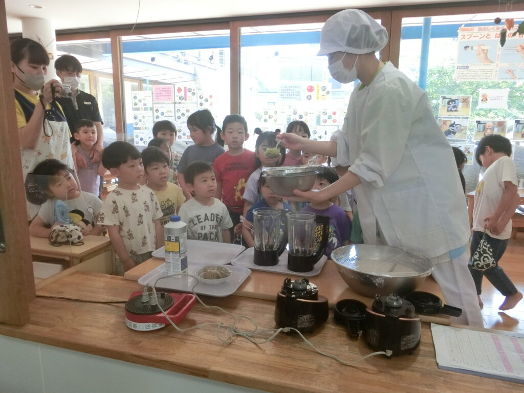 キウイと飲むヨーグルトを使ってミックスジュースを作りました。さわやかなミックスジュースの味に子どもたちも「おいしい!」、「もっと飲みたい」とよく飲んでいました。ビタミン&水分補給をして元気に遊びました。次回、太陽と大地チームも行う予定ですのでお楽しみに。