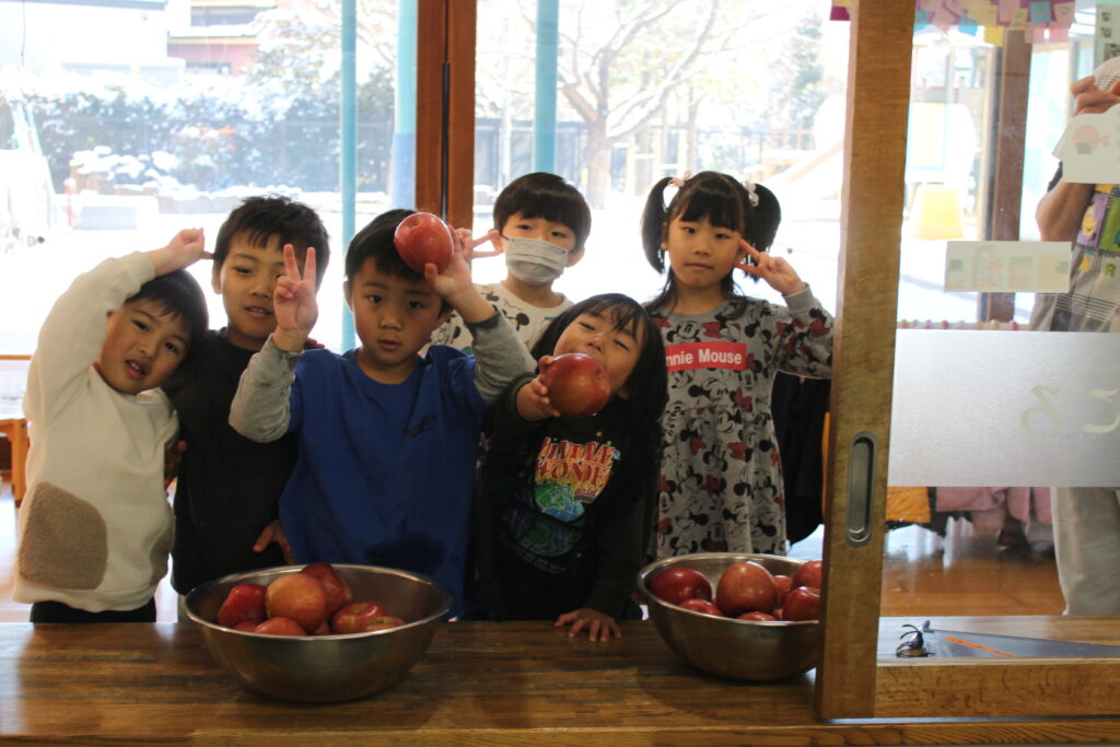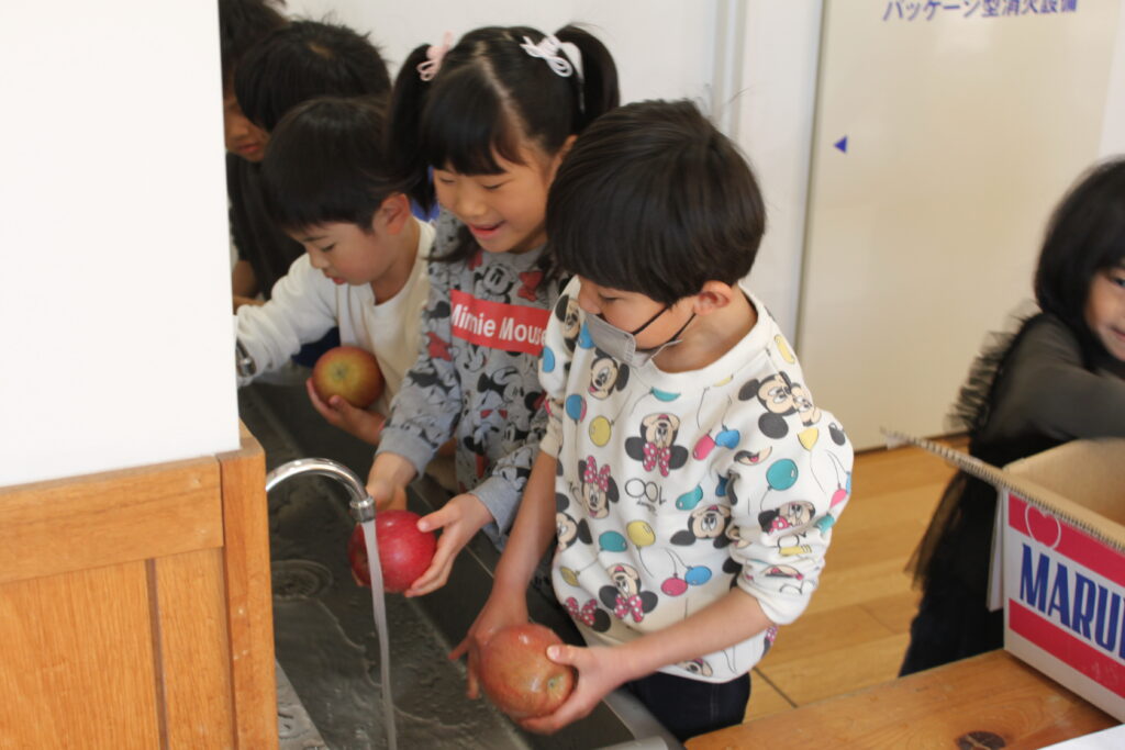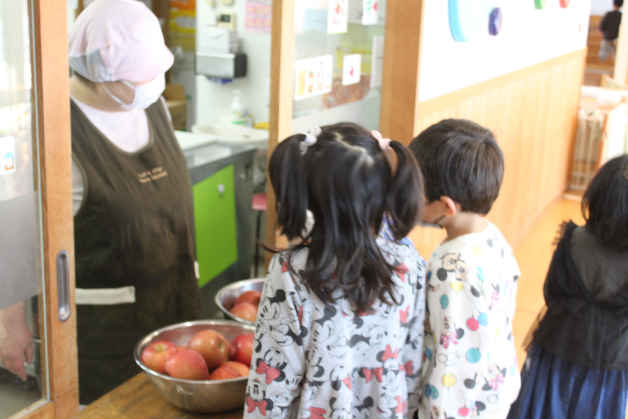 今朝は元気な幼児クラスの子どもたちが給食のフルーツ、りんごを洗ってくれました。