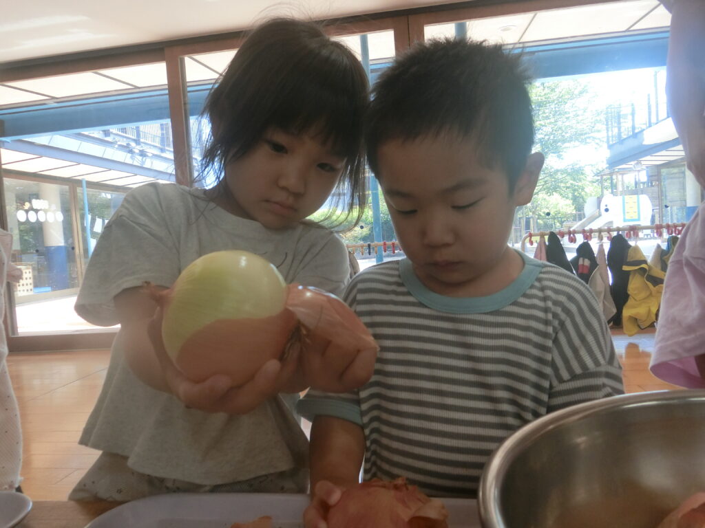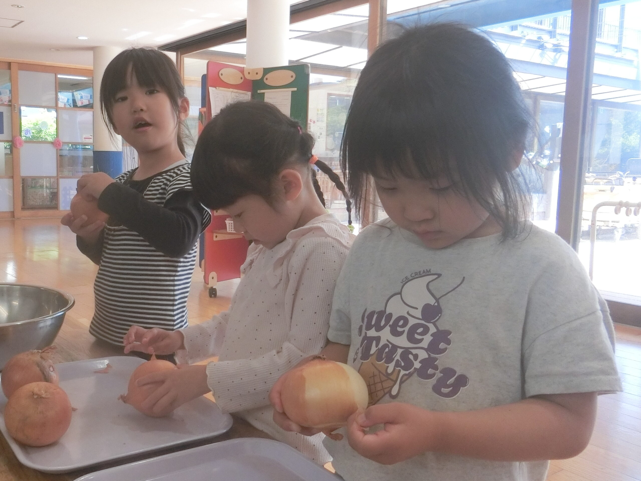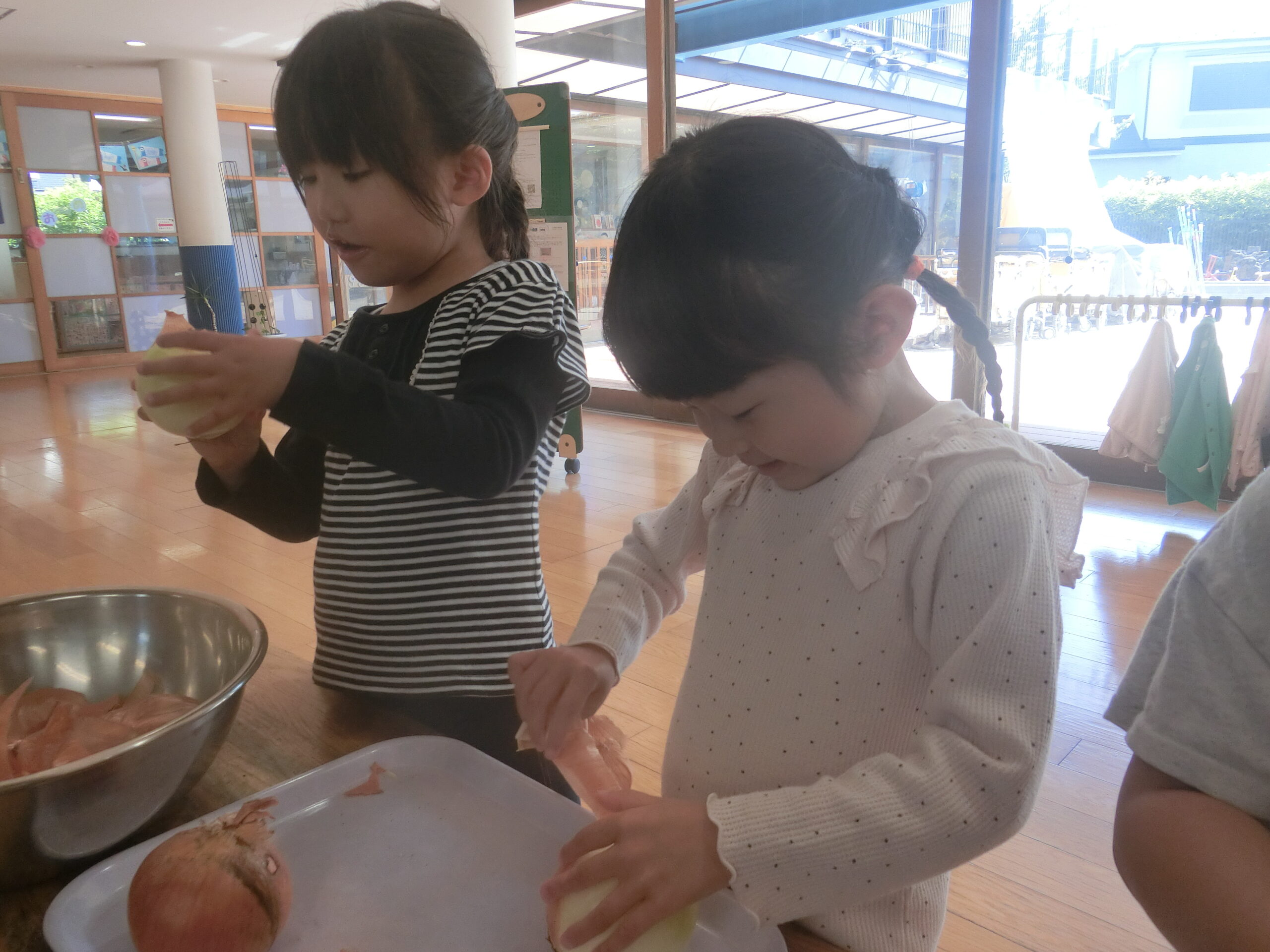 「お家でもおかあさんと一緒にやってるよ!」と和組さん。小さな愛組さんのお友達が混ざって一緒に皮むきが始まると「こうやって剥くと白い玉ねぎがでてくるんだよ」「皮を上からぴりぴりっと剥くんだよ」と優しく教えていました。